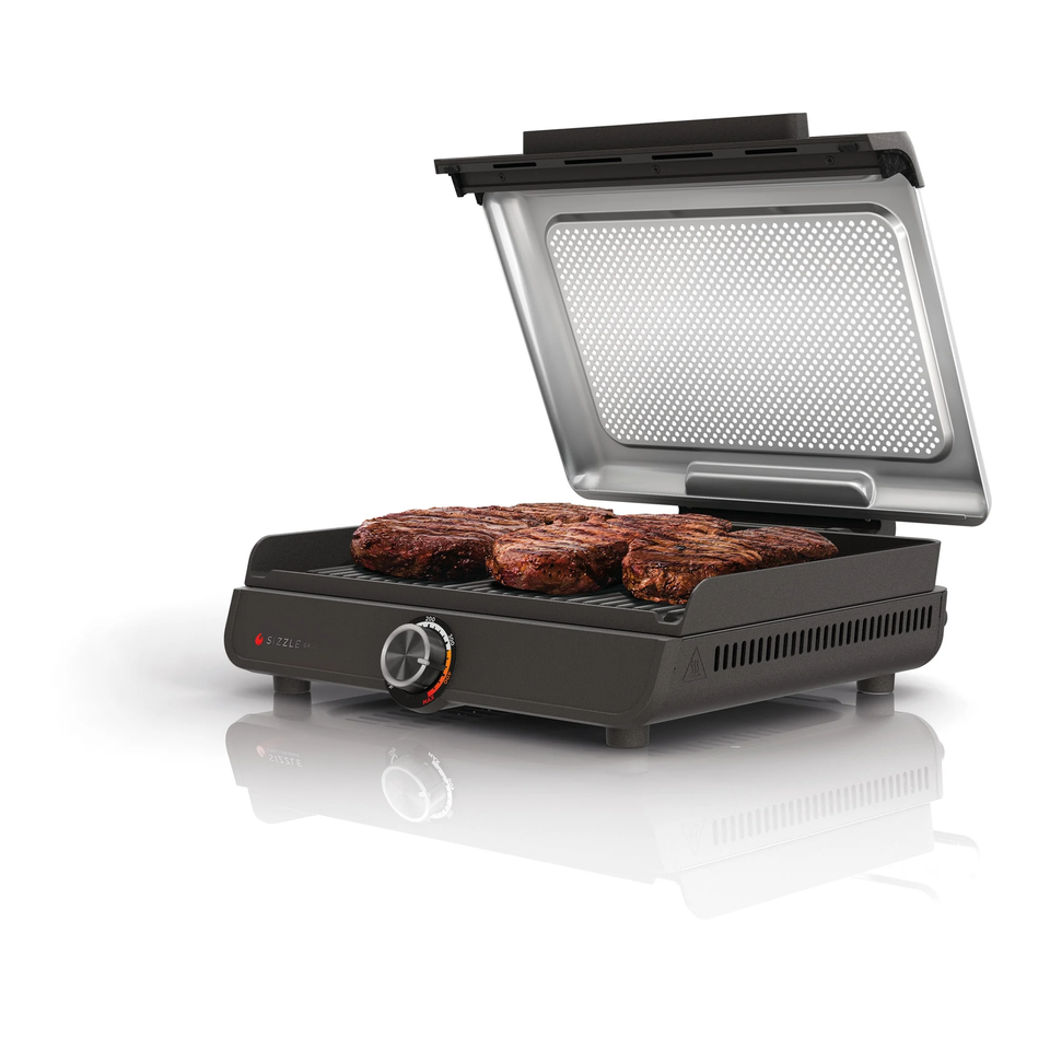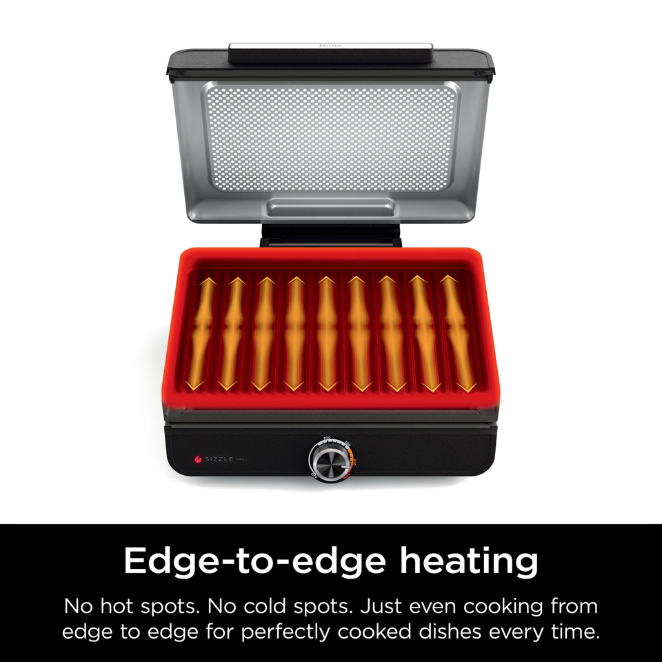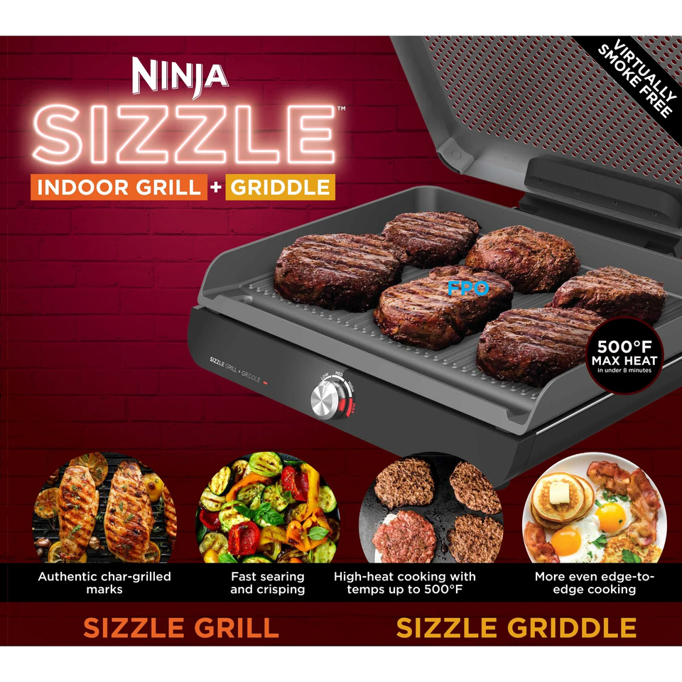 Meet the Ninja Sizzle GR100, the compact indoor grill that high-heat sears and sizzles your favorite meals right from your countertop. Reaching temps up to 500F, achieve the perfect char-grilled marks with direct, edge-to-edge even heat - no hot or cold spots. From crispy veggies to tender chicken breasts, prepare grilled meals that the whole family will enjoy. The Ninja Sizzle smokeless indoor grill comes with a 14?? Nonstick Grill Plate, a Quick Start Guide with 10 Recipes.