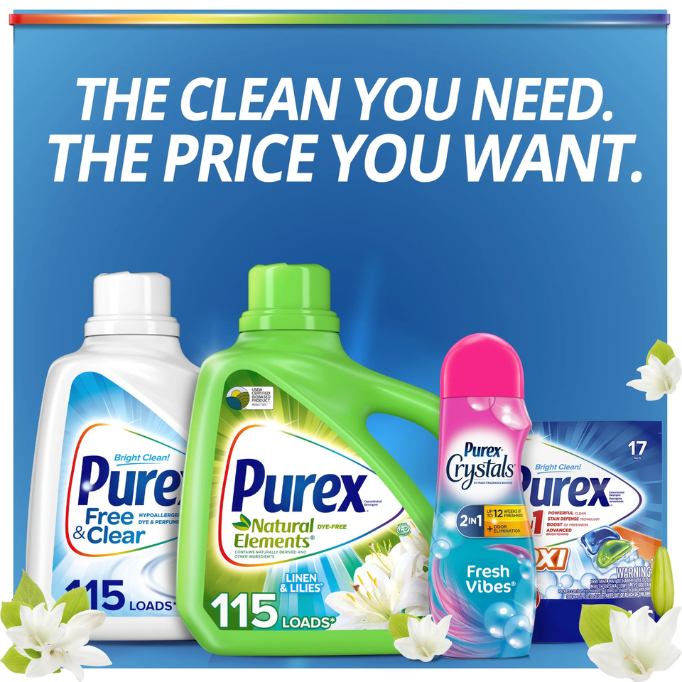 Purex Natural Elements Linen Lilies contains a light scent with the freshness of clean linen and sun-soaked lilies on a warm summer day. Contains traditional and plant-based cleaning ingredients without compromising clean This liquid laundry detergent is 61% USDA Certified Biobased Compatible with all washing machines including high efficiency (HE) washers Purex Natural Elements Liquid Laundry Detergent Linen Lilies 250 fl oz 192 Loads Providing quality products at an affordable price for over 100 years