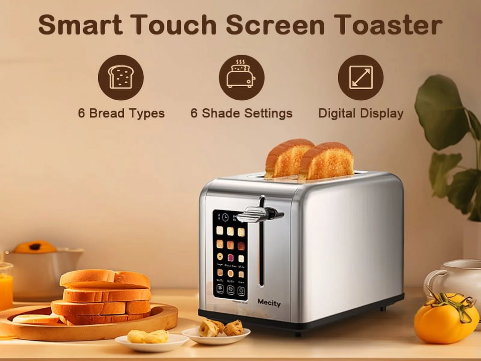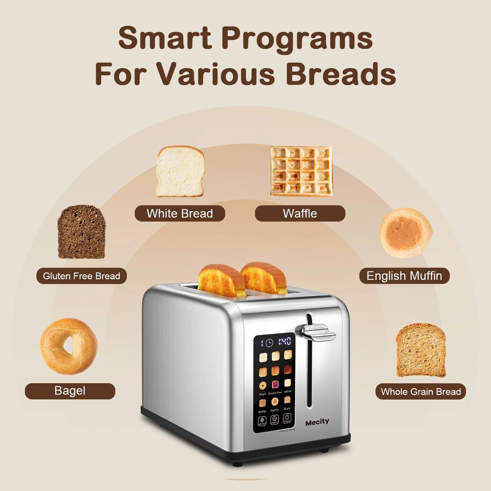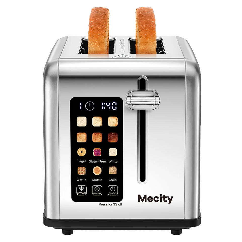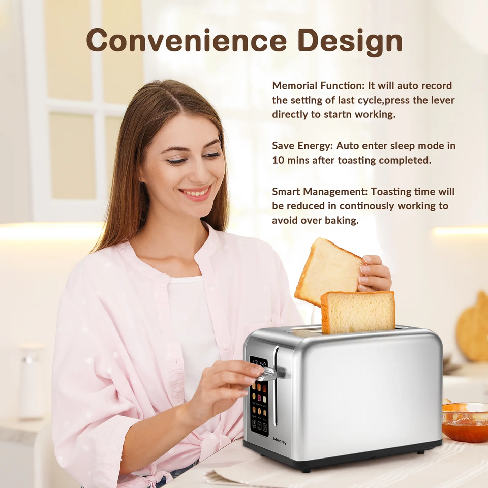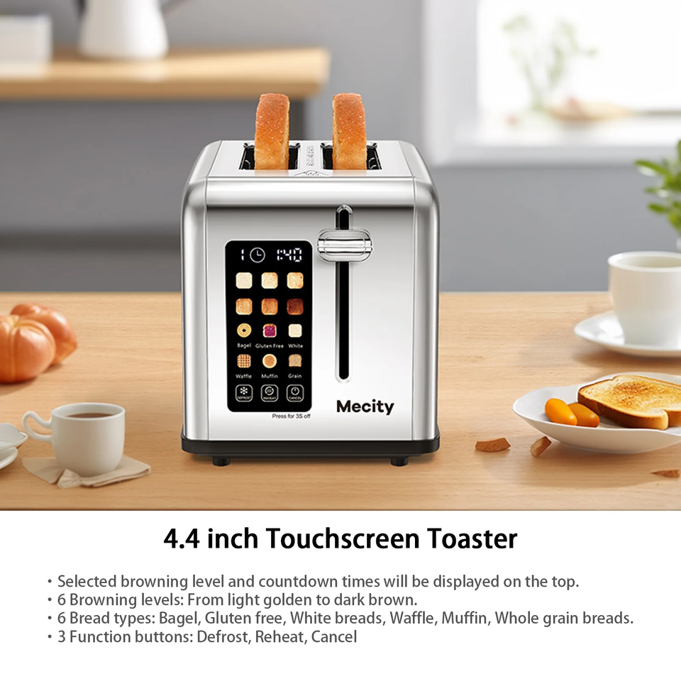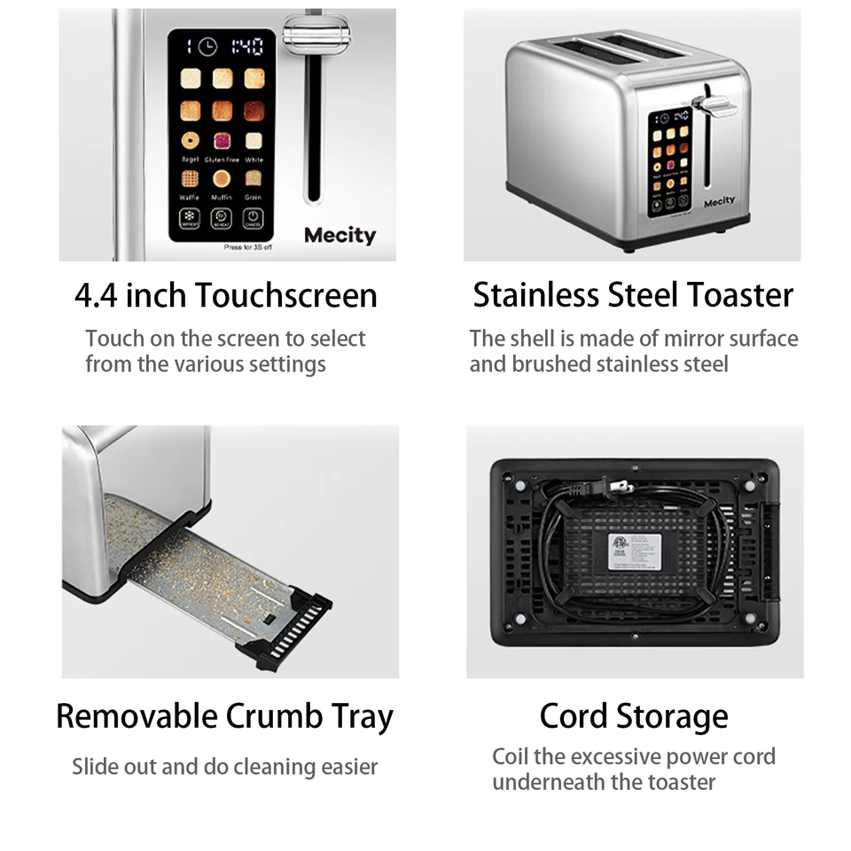Introducing the Mecity Touchscreen Toaster, a 2-slice stainless steel bread toaster that brings modern sophistication to your kitchen. This smart toaster features a large 4.4-inch touchscreen, allowing you to select from 6 browning levels and various bread types with a single click. It ensures even toasting after thousands of tests and adjustments to its structure and heating wires. The toaster's shell is crafted from a combination of mirror surface and brushed stainless steel, offering a shiny appearance and a durable service life. Cleaning is a breeze with its non-stick, food-grade stainless steel toasting slots and a removable crumb tray. Enjoy perfectly crunchy breads with the Mecity Touchscreen Toaster.