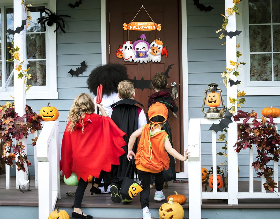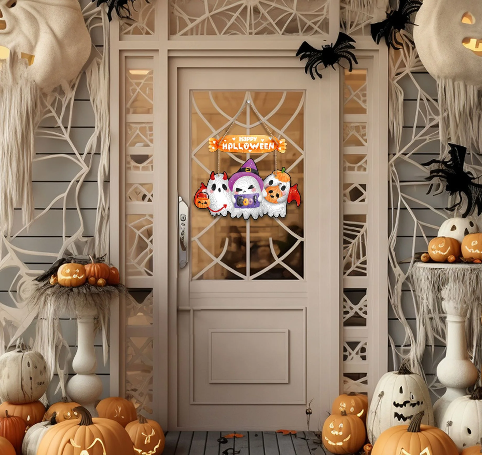 ?Happy Halloween Welcome Sign for Front Door?The Halloween ghost pumpkin decor wreaths sign for front door welcomes trick-or-treaters kids to ask for candy on Halloween. Perfect Halloween welcome sign for home wreaths front door boys girls room door yard garden porch house wall decoration. In addition, this halloween front door wall signs can also decorate schools, classrooms, offices, bars, restaurants, haunted houses and so on.