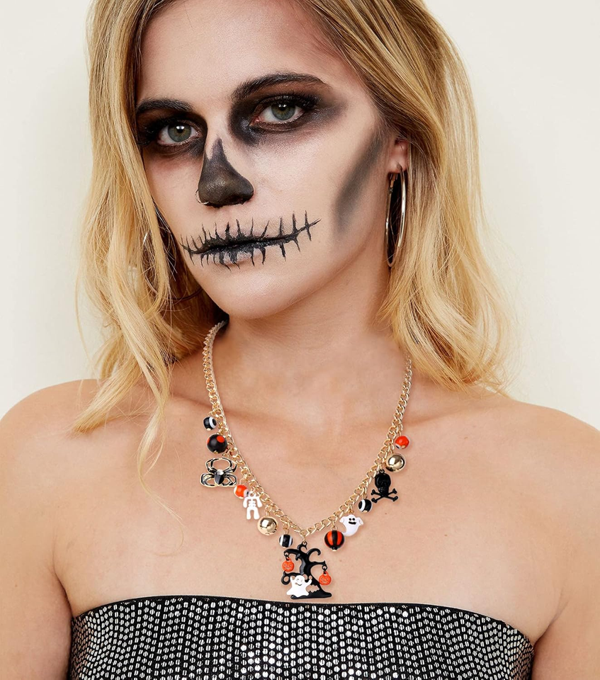 Our Halloween necklace is embellished with delicate charms: white ghost, black switch, black spider, black cat, black beads, orange beads, can be matched with witchy outfit, dress, night's costume or attend party , masquerade or as gift to friend.