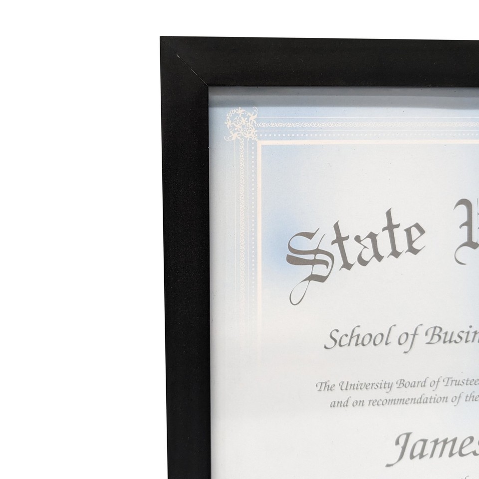 Design: Black 0.5? Gallery 8.5x11 inch Document frame. Quality: Durable, gallery-style frame. The glass has a sturdy backboard which will help keep your photo snug in place. Material: Constructed of MDF composite (pressed wood/fiberboard) and polished glass front that gives a clear view of your photo. Use and Display: Perfect for 8.5x11 inch documents or picture or art. Includes triangle hangers on back for hanging horizontally or vertically. Outer dimension: 9x11.6?. The glass is easily removable.