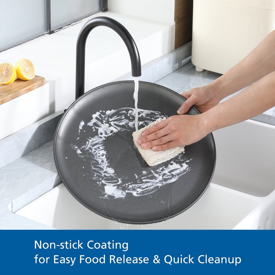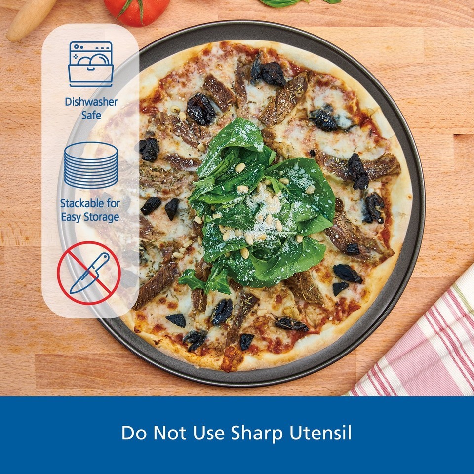 Pizza Pan can accommodate a 16" diameter pizza and all the toppings Dimension: 16 in dia (40.6cm) Although bakeware is dishwasher safe, wash in mild dishwashing detergent and warm water before first and after each use Non-Stick surface for easy release and quick cleanup Durable steel construction