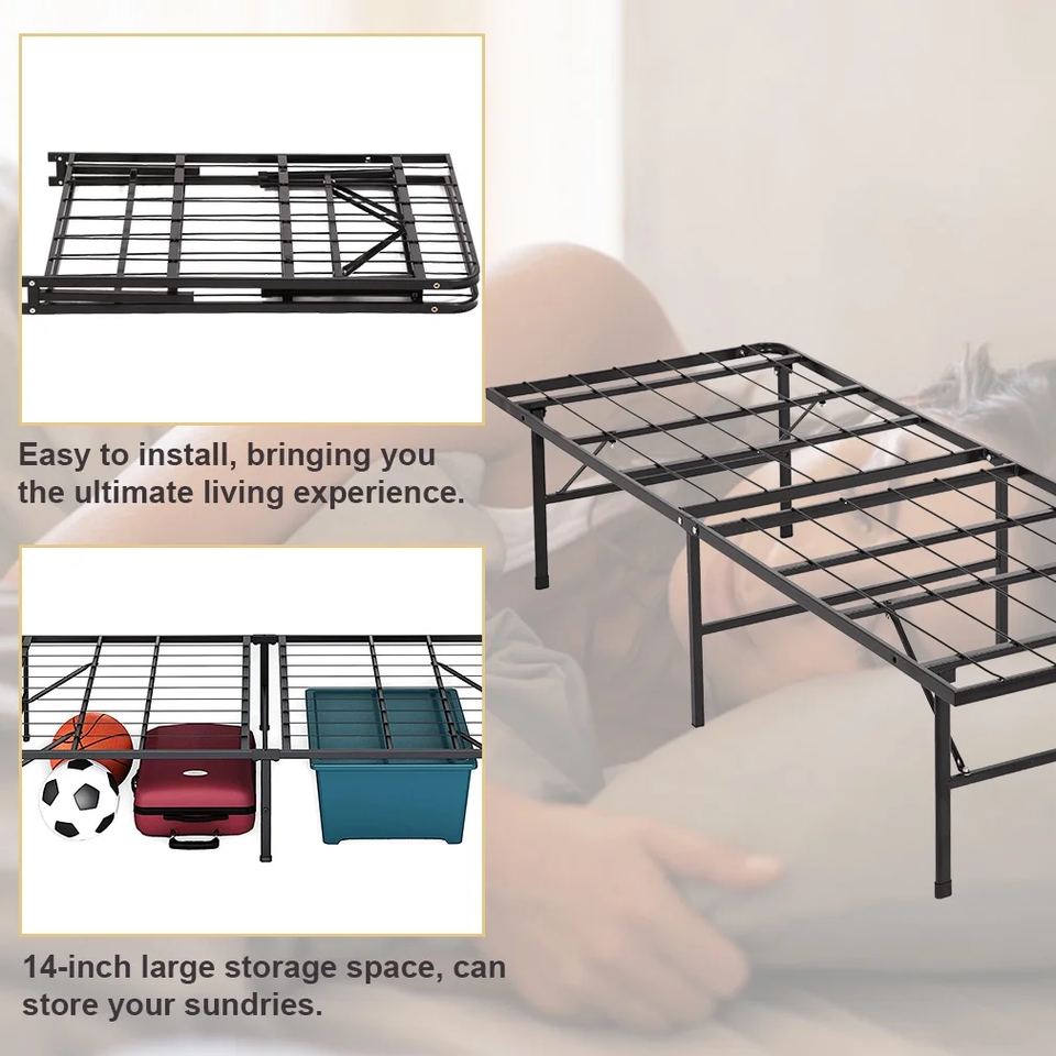 Easy Assembly: The bed frame requires assembly but is designed for easy disassembly, making it convenient for storage or moving. It features a 14-inch platform height with 12.5 inches of under-bed storage Sturdy Construction: Built with a heavy-duty steel slat system and six supportive legs, this platform bed frame is ideal for today? os heavier mattresses, including memory foam and latex Compact Shipping: Ships in a small, compact package that fits through narrow doorways, hallways, and stairwells for easy handling Versatile Use: Suitable for a variety of home settings, offering a reliable foundation for a full-size mattress Durable and Reliable: Designed with a heavy-duty steel frame, this bed frame provides lasting support and stability