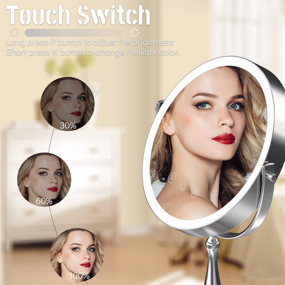 ?1X/10X Double-Sided Magnifying Mirror?Getting all details of your faces with a 10X magnifying cosmetic mirror, which is ideal for make-up, eyebrow tweezing, facial care, and hair styling. The led makeup mirror can be 360 swivel freely. Easy to find the perfect viewing angle of this vanity mirror with lights without effort.Note: You should be at least with a distance of 4 inches to mirror for a more detailed and less distorted image or dizzying.
