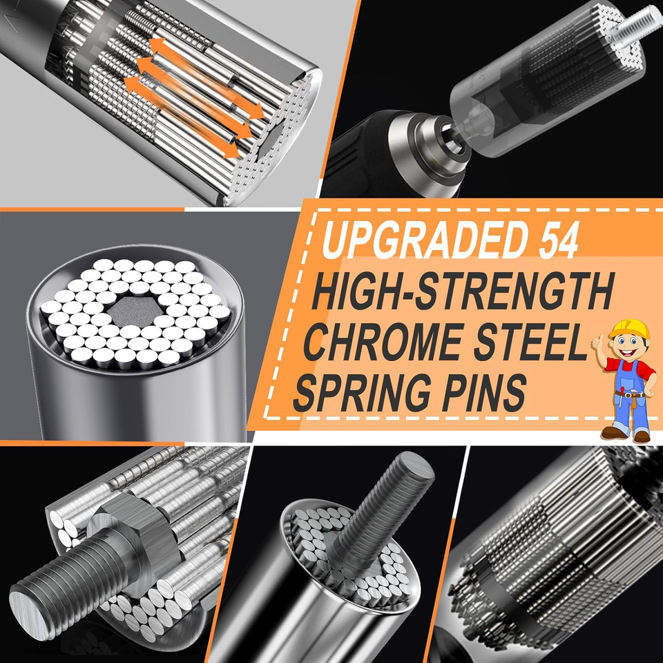 Clever and Useful Tools Ever: Universal socket grip is equipped with power drill adapter, easy connect with most electric drills, electric screwdrivers and manual ratchet set. The brilliant universal socket instantly adjust to grip most metric, wing nuts, broken nuts, stripped nuts, eye bolts, square nuts, hexes and most irregular shape. This magic socket is must have all in one tool for both the professional and the average person. Great addition to your toolbox, cool gift for men and family