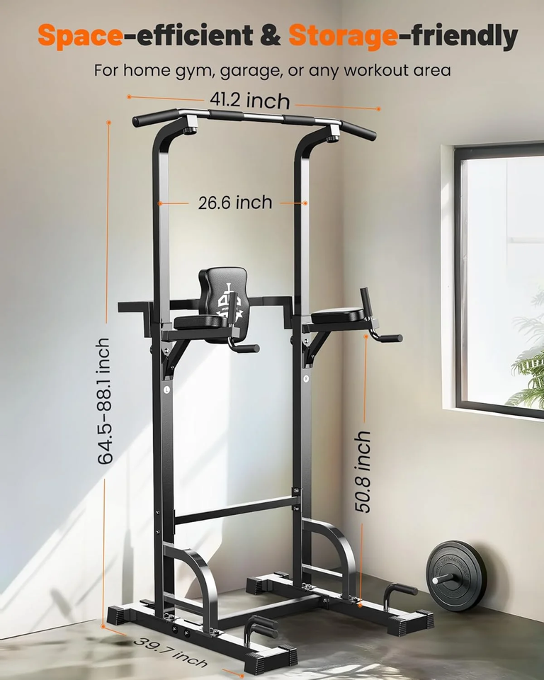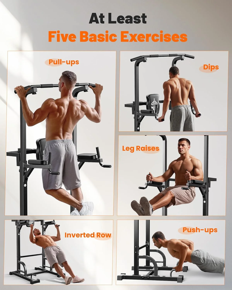 Sturdy Construction Comes with a 14-gauge heavy steel frame constructed with scratch-resistant coat finish, our power tower can hold rider's weight up to 400lbs and withstand long-term use. Double Stability Our power tower owns a 40.2'' long-size H-shape base. The long base provides more loading points. support points are formed by the extended steel, which increases the contact area and provides double stability. Multi-Function It is a multi-functional power tower that supports vertical knee raise, push-ups, dips as well as pull-ups, which help tone and target your arms, core, shoulders, chest, and back for a stronger upper body. Ergonomic Design Humanized design with PU pads for elbow protection. With adjustable holes to support the armrests and six adjustable backrests, the back pad of the power tower can be adjusted before and after based on the people's size. Meet the fitness needs of all adults at home and in the office. 11 adjustable heights, and 11 adjustable holes on the support tube (1.2"-13.2") The height of the pull bar can be adjusted from 75" to 87.8", suitable for all different height fitness enthusiasts.
