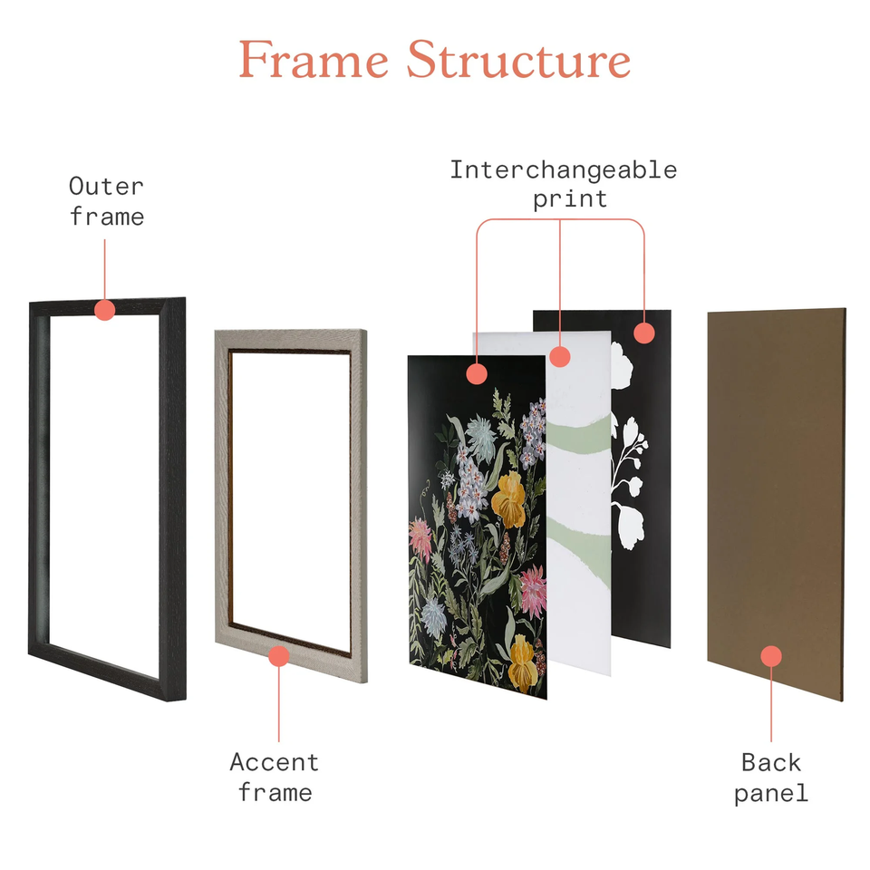 Change your wall decor to reflect a new theme of the day with this 3-piece interchangeable wall print set plus frame by Beautiful. Each set includes two bygone botanical motifs, one in charming color and the other in classic black and white, with a modern twist. The third print is a unique abstract featuring white waves on a light green background, perfect for adding a creative touch. The double-layered frame with a glass cover is well-constructed and securely fits all three prints stacked on top of each other, making it easy to store the ones you are not using. Try out this set in different rooms and instantly watch the space come to life. Hanging this piece is a breeze, thanks to the discreetly placed D-ring hanger on the back, ensuring an easy and balanced hang. Switching out the prints is also easy. Remove the back cover by moving the frame points, and select the image you want by moving it to the top of the stack!