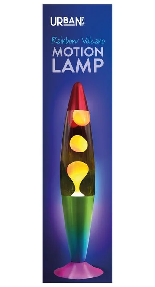 Urban Shop 16" Rainbow Motion Volcano Lamp, White Wax in Clear Liquid, Rainbow Painted Metal Base Part of our collaboration with the Urban Shop Novelty Lighting Collection Measures: 16" H x 4.2 W x 4.2" D Includes a plug in power adaptor for easy use to plug into the wall Comes with an On/Off switch Wipe clean for easy care and maintenance Includes incandescent bulb Recommended warm up time is 1.5 hours The Urban Shop Motion Volcano Lamp is also available in Blue, Pink/Purple, Galaxy, Rose Gold, Yellow/Blue, and Pink/Orange Ombre Sunset Place on your nightstand, table, or desk Perfect for any room of your home!