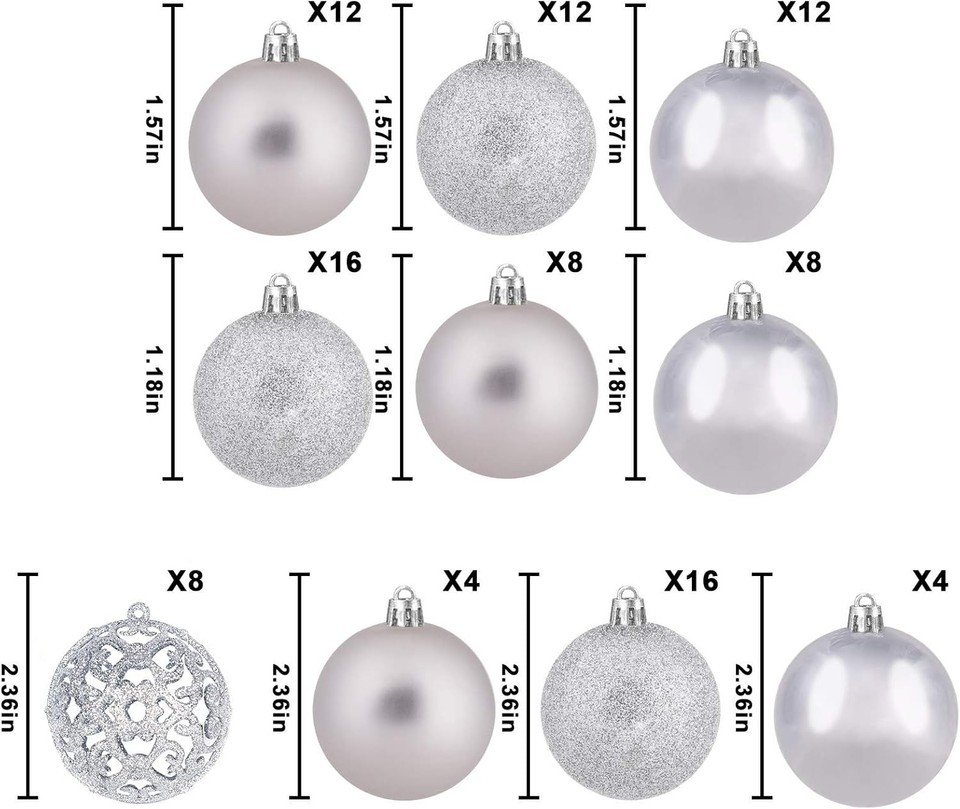 ?VARIOUS SIZE?The Christmas balls' diameters are 3cm/1.18'' and 4cm/1.57'' and 6cm/2.36''. These are the most widely used sizes for Christmas tree's decoration.