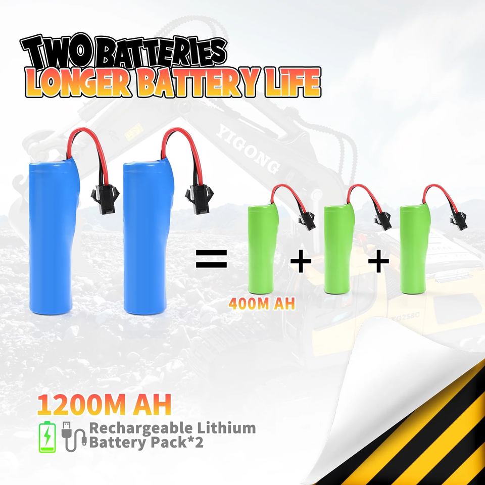 ?2 Bigger Capacity Batteries? Upgrade 1200mAh large battery has as much energy as your lively kids. Giving the remote control excavator the battery installation requires screws to twist open the battery cover in the installation on.or more room to play. Give your child unlimited construction enjoyment. ?Multi-channel joystick will?The toy excavator can be flexibly manipulated for digging, handling, lifting, etc.. Channels can be operated individually or together. Mechanical sounds and flexible mechanical arms are highly featured, which are controlled by real, easy-to-use joysticks. Auto demonstration also help kids better operate. ? 1:20 high simulation Multi-functional remote control excavator?The core components of the excavator are made of metal, giving a heavy and high-quality feel. The vehicle?s overall design is exquisite, highly realistic, and has collectible value. Good quality with alloy bucket, powerful motor, 2.4Ghz multi-channel controller, light and sound. More durable. Even if multiple people play together, they will not interfere with each other. ?Mighty Alloy Bucket?Performs well on real digging and lifting a shovel full. Can coordinate with the unique and realistic cab swiveling within 680 degrees, not limited by any direction. And the excavator moving forward/backward/turn left/turn right. ?Solid Outdoor Play Gifts?This exquisite remote control excavator is suitable for 3 years old holiday gifts, Withstand rough playing on sand, dirt, gravel and other terrains. Well made tracks won't come off or get stuck by sand. Your kids will be thrilled to receive it on their birthday, Thanksgiving, Christmas/X-mas. ?Add to Construction Fleets?Combine with our construction vehicles to enjoy building on the beach/sandbox with friends or family. Links to Dump Truck of the same series: