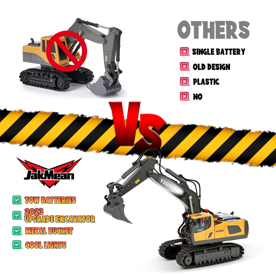 JakMean Half-Metal Remote Control Excavator Toys is the perfect gift for children over 3 years old. This multifunctional remote control toy excavator features a realistic cab that can rotate 680 degrees without any direction restriction. Its alloy bucket and powerful engine make it a high-performing toy that can keep children entertained for hours. Realistic lights and sounds, it provides a fun and immersive experience for kids. Rubber tracks allow our toy excavator can be driven on various terrains such as sand, grass, and mud. The powerful alloy bucket excels when actually digging and lifting a full shovel, allowing children to develop their hands-on and independent thinking skills while having fun.
