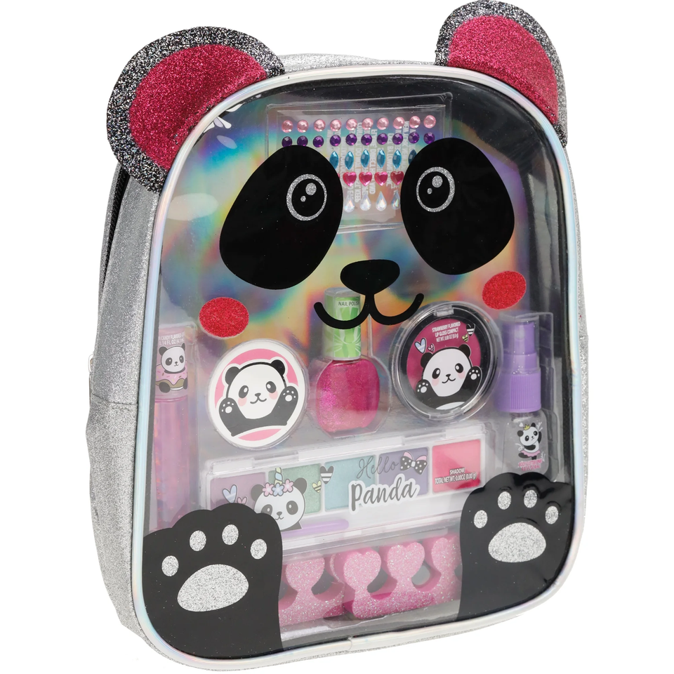 The Townley Girl seven piece panda bear inspired cosmetic makeup set is the perfect gift for that special tween in your life. She will love this adorable backpack filled with beauty essentials. Painting her nails and dressing up her lips never looked so adorable! This backpack is perfect for the back to school season or makes a great holiday gift solution. Fun and easy to apply, non-toxic nail polish and other cosmetics enables the girls to explore fashion and beauty safely. Our non-toxic, water based polish is easy to remove by simply peeling off the dried polish, so no need for harsh nail polish remover. Safe for children three and up. Comes with One Nail Polish Bottle, A Set of Nail Spacers, One Roll on Fragrance, One Body Glitter Spray, One Eye Shadow Compact Complete With Five Colors in the Palette, and One Lip Gloss Compact