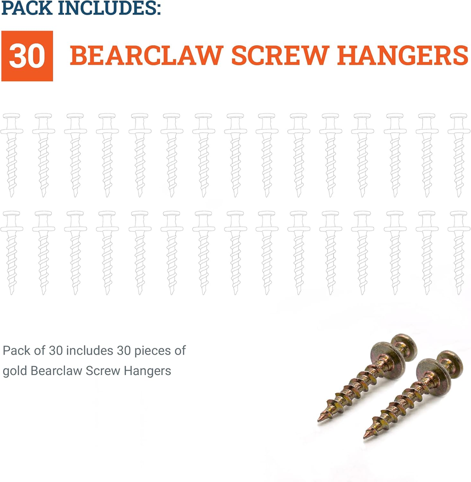 Bear Claw Screw Picture Hanger Gold - 30Lb Picture Hooks - 4-In-1 Picture Hanging Screws for D-Rings, Sawtooth, Wire and Keyholes - Mounts in Drywall and Wood Studs 30 Pack Screw Anchors