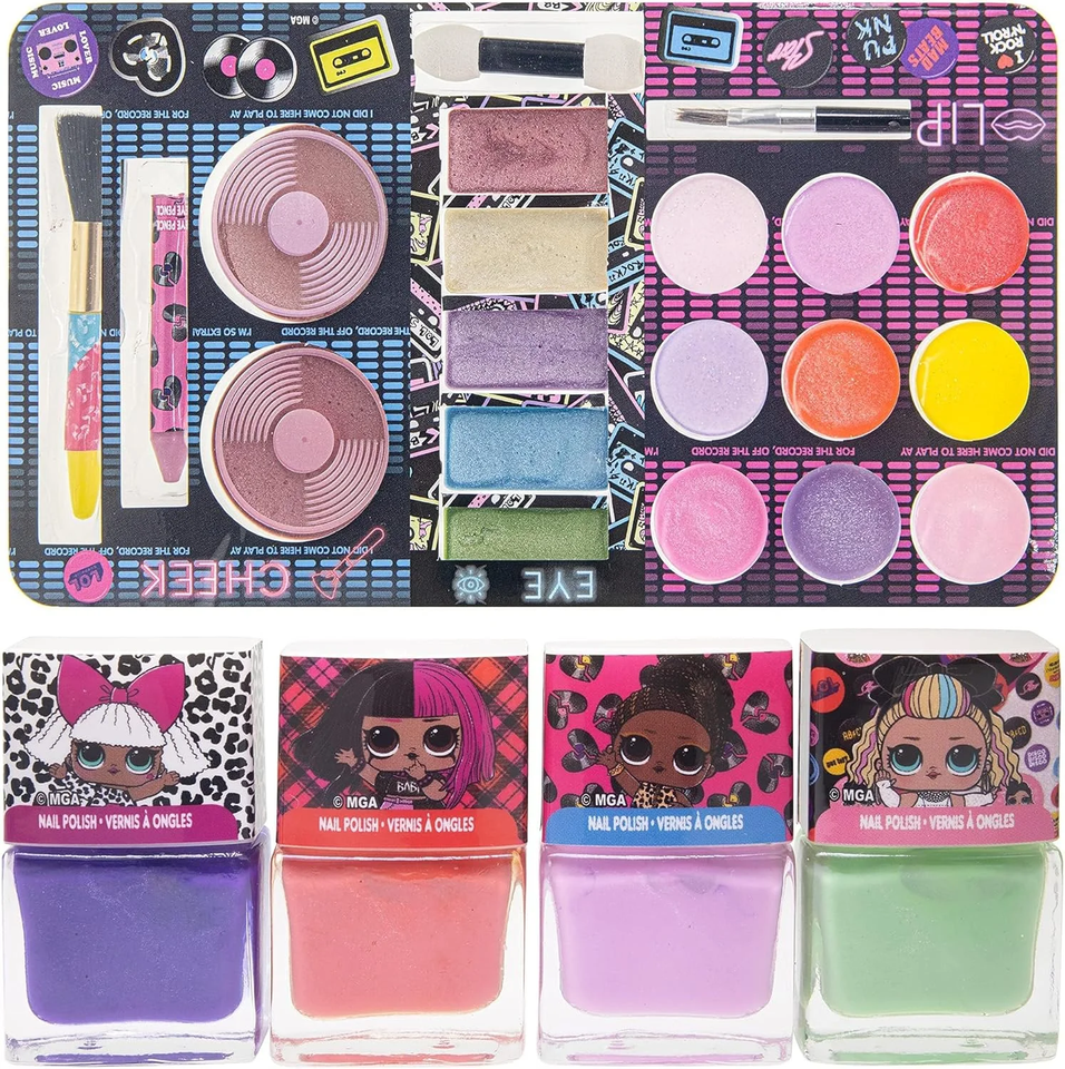 1 set of makeup for girls in an L.O.L Train Case 3 brushes for lip, eye, and cheek, 2 toe spacers, 4 nail polishes, 2 scrunchies 1 nail file, 2 hair bows, 1 sequin hair bow with puffy icon, 1 headband w/ bow 3 bobby pins, 15 glittery bobby pins, 2 snap hair clips, 20 hair ties on clip, 1 glittery pencil 2 cheek shimmers, 5 eye shimmers, 9 lip glosses and more