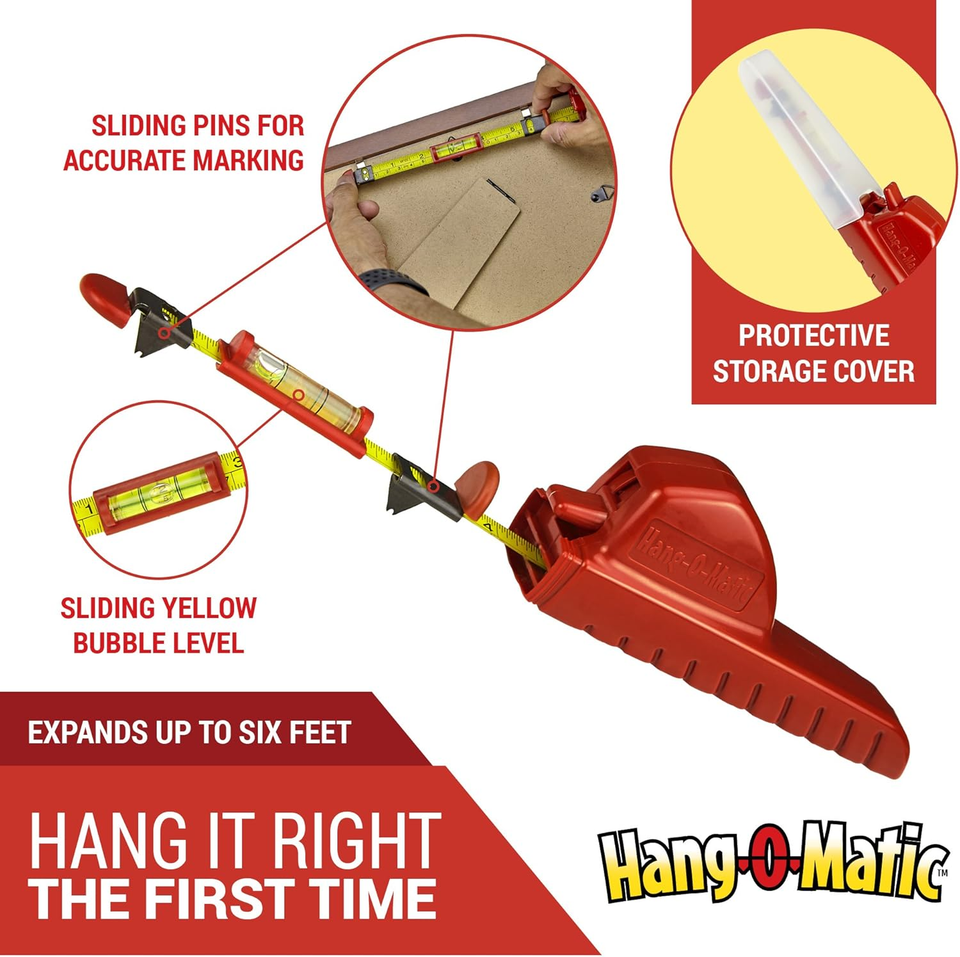 Guiding the user to accurately mark the wall in a desired position, the Hang-O-Matic Tape Measure includes a sliding yellow bubble level and contains sliding pins for accurate marking the first time. It also expands up to six feet for larger items and allows the user to hang items both horizontally and vertically.
