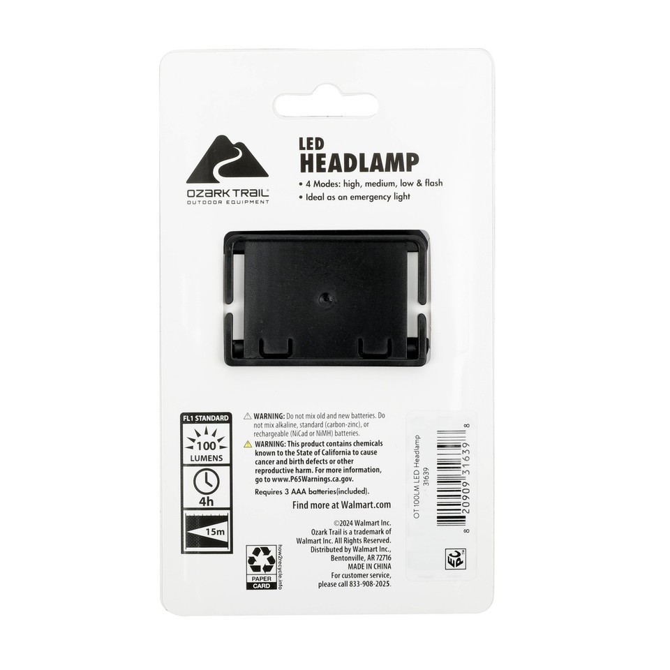 Ozark Trail Single LED Headlamp, 100 Lumens, Blue Great for an emergency light Super bright LED headlamp Soft touch rubberized coating finish 4 Modes: low, medium, high, and flash High setting: 100LM/2H/25M