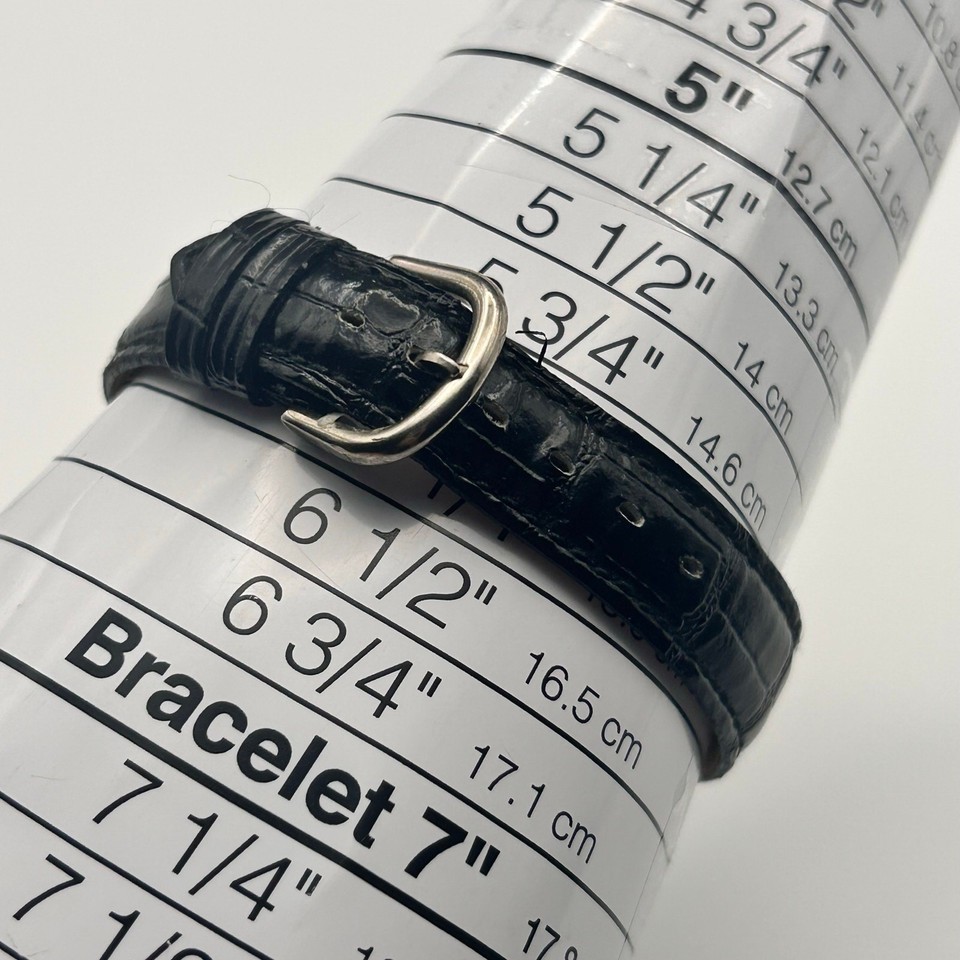 Featuring a sleek black leather band and a sophisticated design, this watch is perfect for any occasion. It has been recently serviced with a new battery, so it's ready to wear and enjoy.