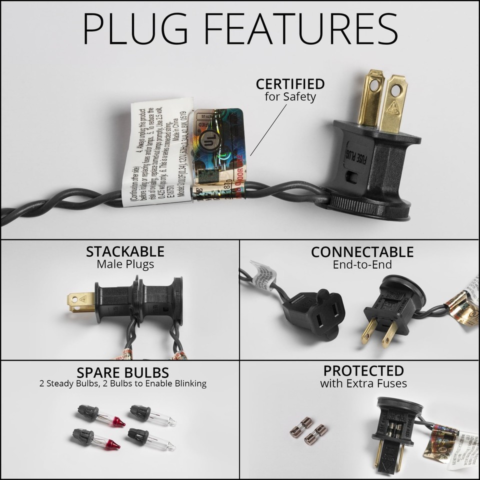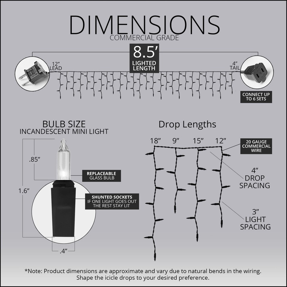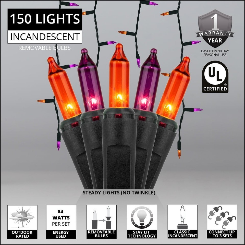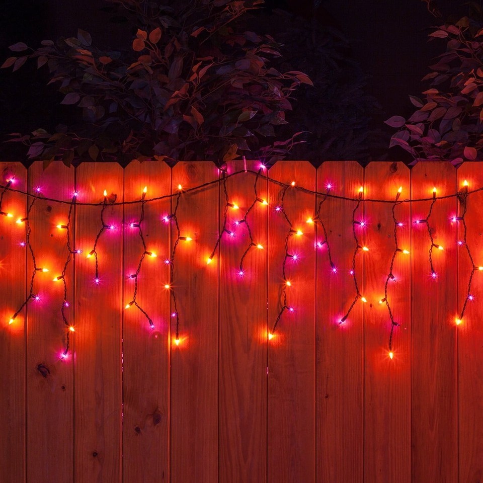 150 purple, orange icicle lights on black wire, 12" lead and 4" tail, 8.5' total length 27 drops ranging from 9" to 18" in length, for that authentic icicle light look Light strings last an average of 3,000 hours, giving you years of superior lighting Tighter twists reduce tangling, resulting in a more professional looking light display Connect up to 3 light sets for quicker installation with less required outlets Bulbs are removable and replaceable; if one light does go out, the rest stay lit UL listed for quality and assurance Rated for indoor/outdoor use