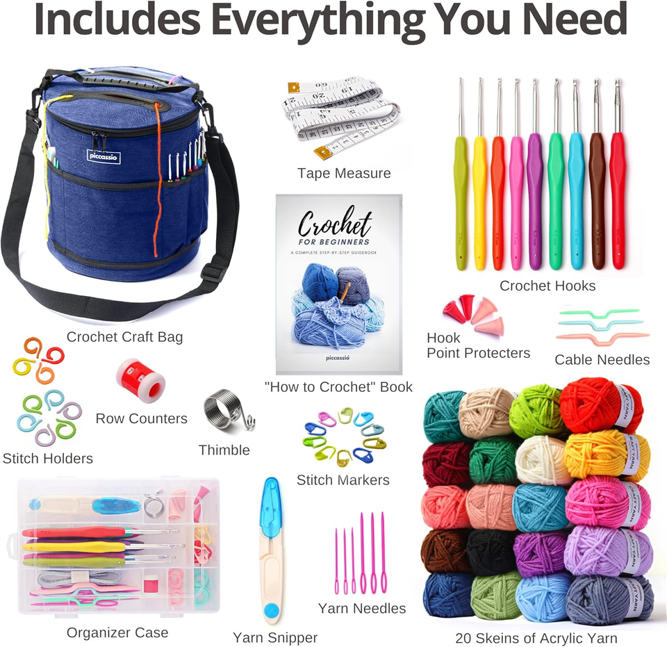 Your Perfect Companion: The Piccassio Crochet Kit for Beginners is designed with beginners in mind! It's a fantastic choice for adults and kids ready to embark on their crochet journey. This beginner crochet kit for adults includes everything you need?20 vibrant spools of yarn, comfortable acrylic crochet hooks, a helpful "Crochet for Beginners" book, and a variety of handy accessories.