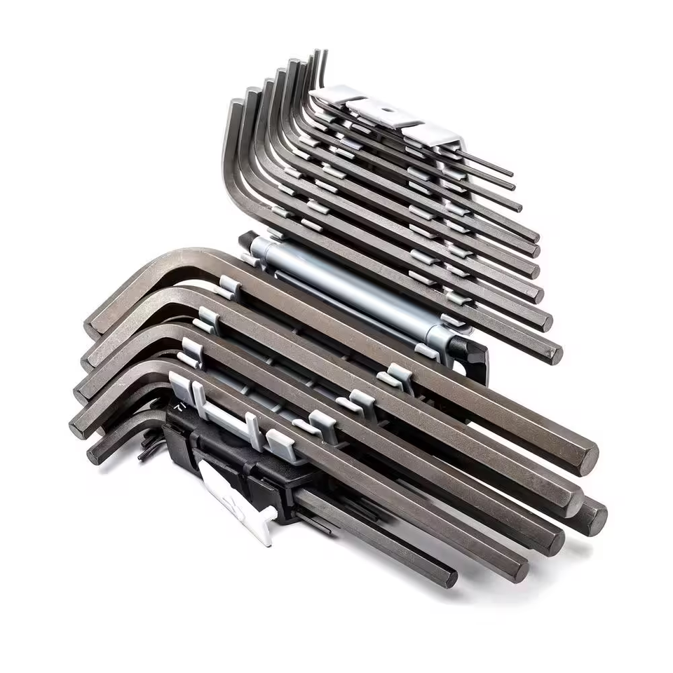 The Husky 26-Piece Hex Key Set includes 13 SAE and 13 Metric hex keys made from alloy steel for long-lasting wear. The hex keys feature a chamfered-end design to help guide the key into the fastener. The Allen wrenches resist rotational distortion and come in a variety of SAE and metric sizes. The finish provides resistance to corrosion while the included caddies help you keep them organized. Keys are also stamped with sizes for easy identification in your work environment. The two color coded caddies also connect so you can keep all of your Hex Keys in one place.