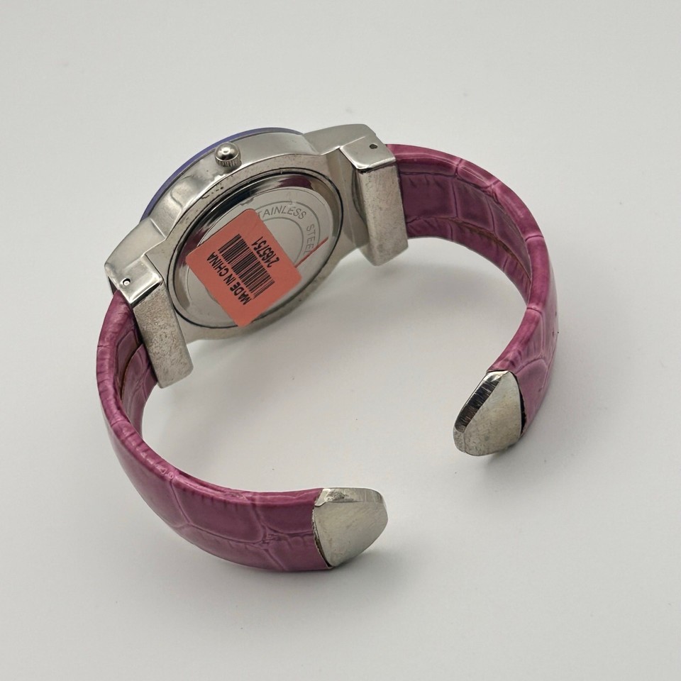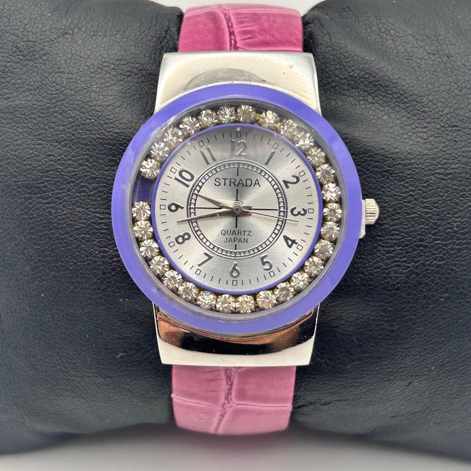 This stylish Strada women's quartz watch features a beautiful crystal dial and a chic pink bangle. The 34mm size is perfect for everyday wear. This watch is pre-owned but in great working condition. Add a touch of elegance to your wrist with this eye-catching timepiece!