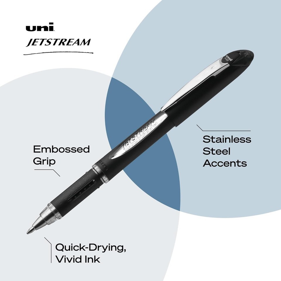 Write with greater speed and efficiency using JETSTREAM Ballpoint Stick Pens from uni-ball. The pens deliver an incredibly fast, clean writing experience that helps you jot down your thoughts and ideas quickly. Combining the silky smoothness and vivid vibrancy of a gel pen with the fast-drying efficiency of a ballpoint, these JETSTREAM ballpoint pens offer the best of both worlds. Quick-drying ink resists smudges and smears, making this pen suitable for left-handed writers. An embossed grip offers better control when writing, while contemporary stainless steel accents offer a stylish appeal. JETSTREAM stick pens feature pigment-based uni Super Ink technology that settles deep into the paper, offering three-way protection against fraud, fading and water.