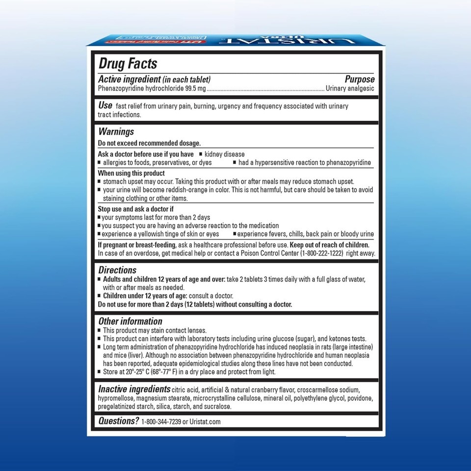 Don't wait for relief! URISTAT Ultra tablets provide maximum strength UTI pain relief with the highest dose available of over-the-counter Phenazopyridine Hydrochloride, the #1 doctor-recommended ingredient for UTI Pain.* URISTAT Ultra provides fast, temporary relief from urinary pain, burning, urgency and frequency of urination. URISTAT Ultra tablets are easy-to-swallow with a cranberry flavored coating. With a UTI, it's common to experience urgency, pain and/or burning during urination, passing small amounts of urine, pink- or brown-colored urine, strong-smelling urine, pelvic pain and/or pressure and cramping in lower abdomen or back. From the makers of MONISTAT, URISTAT Ultra tablets help bring fast, temporary relief of UTI symptoms, while an antibiotic works to clear the infection. See package for full instructions.*IQVIA ProVoice Survey February 1, 2019 to January 31, 2020. URISTAT Ultra products are FSA- and HSA-eligible in the U.S.