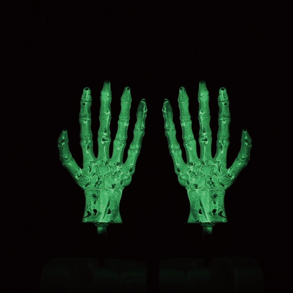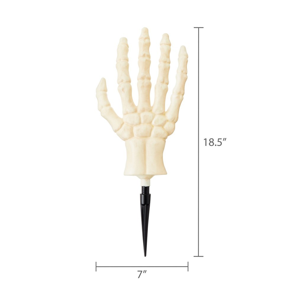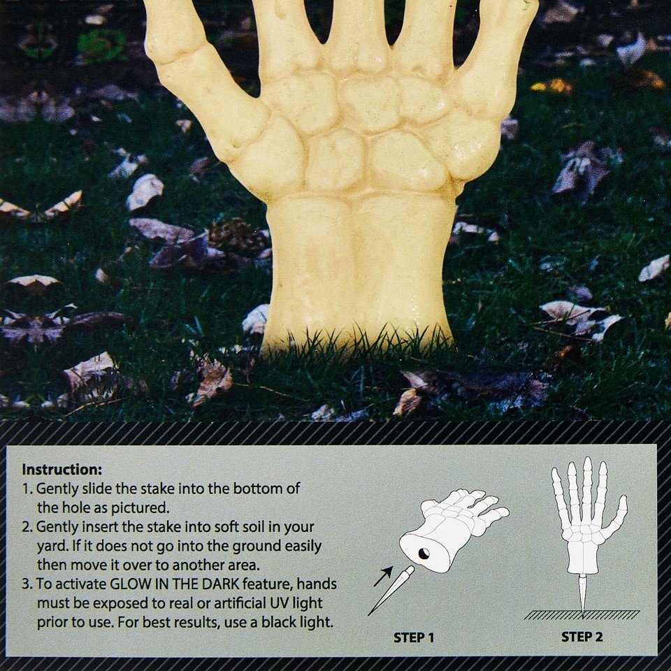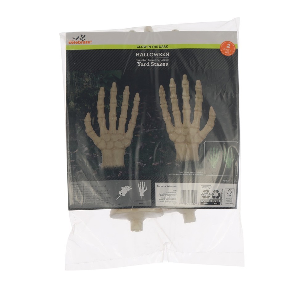 Way To Celebrate Halloween Glow-in-the-Dark Skeleton from the Grave Yard Stakes Includes two skeleton hand stakes per set Each hand measures 18.5 inches tall and 7 inches wide Glow-in-the-dark finish charges with sunlight or UV light Perfect for haunted lawns, walkways, or garden beds