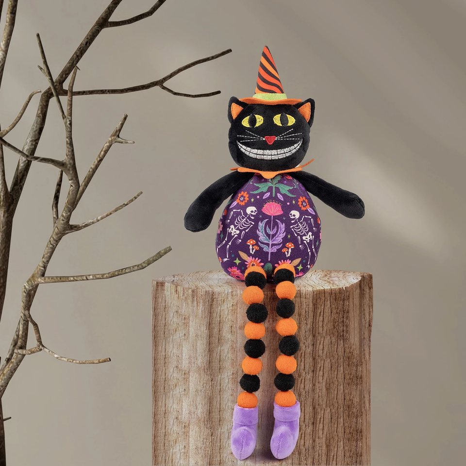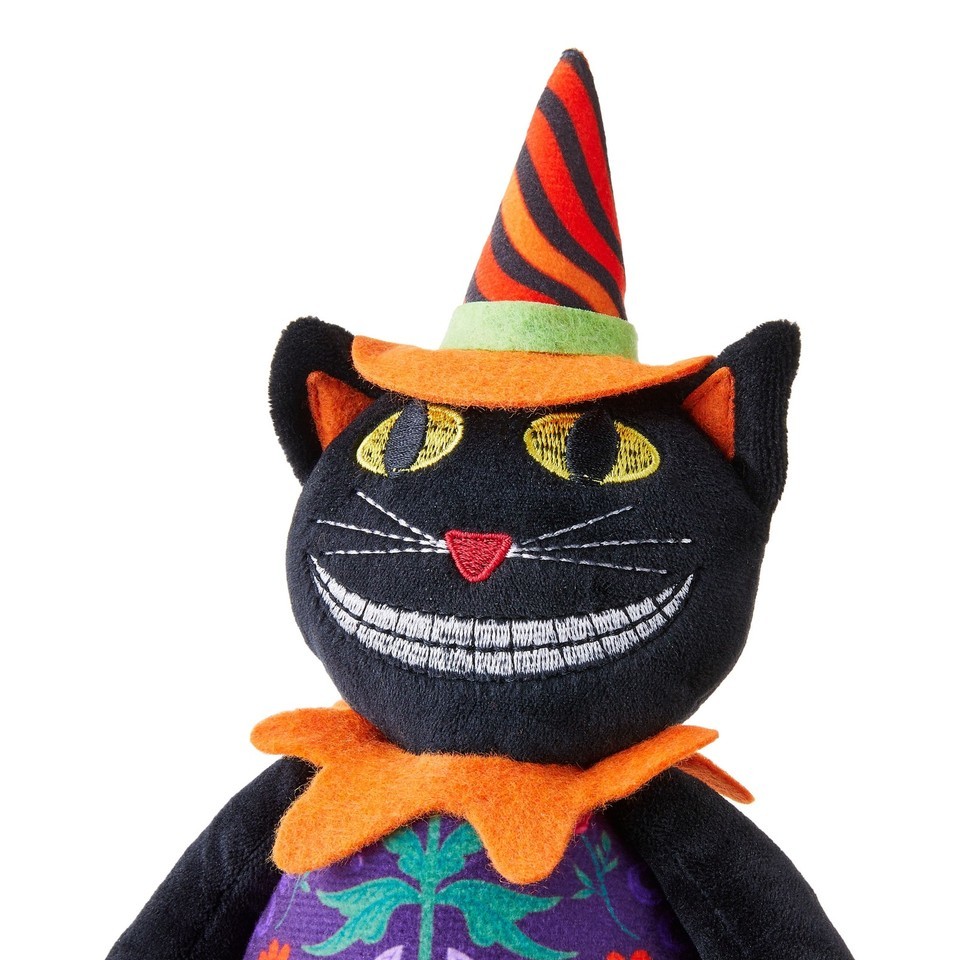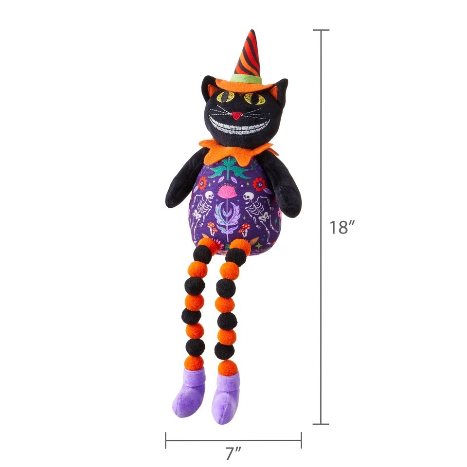 Way To Celebrate Halloween Plush Vintage Grinning Cat Tabletop Decor, Multicolor, 18" Features a grinning black cat with striped hat and colorful outfit Soft plush body with vibrant floral and skeleton print Pom-pom legs add playful movement and texture Perfect for shelves, tabletops, or anywhere that needs some feline flair Measures 18 inches tall from hat tip to paw for standout Halloween charm