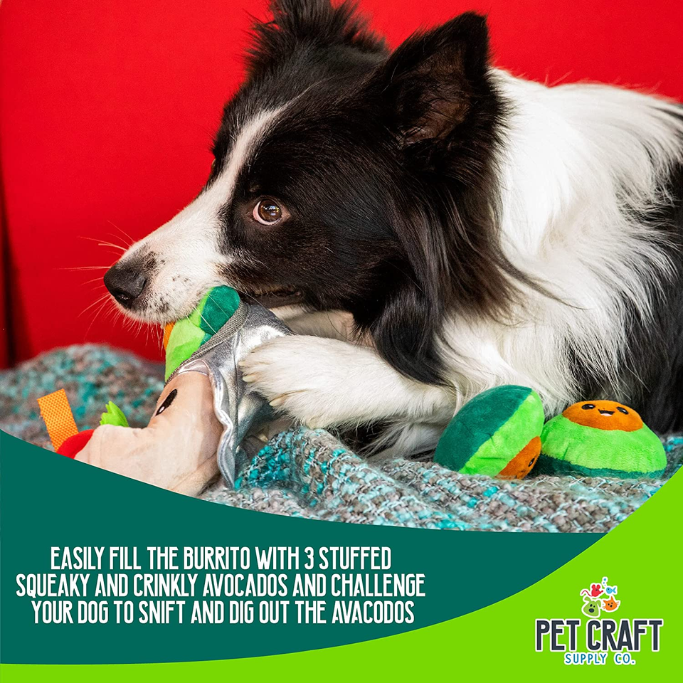 SQUEAKY, CRINKLY, INTERACTIVE FUN: Keep your dog entertained all day long with the Pet Craft Supply Hide and Seek Plush Dog Toys! Easily fill the burrito with 3 stuffed squeaky and crinkle avocados and let your put burrow into it for loads of fun!
