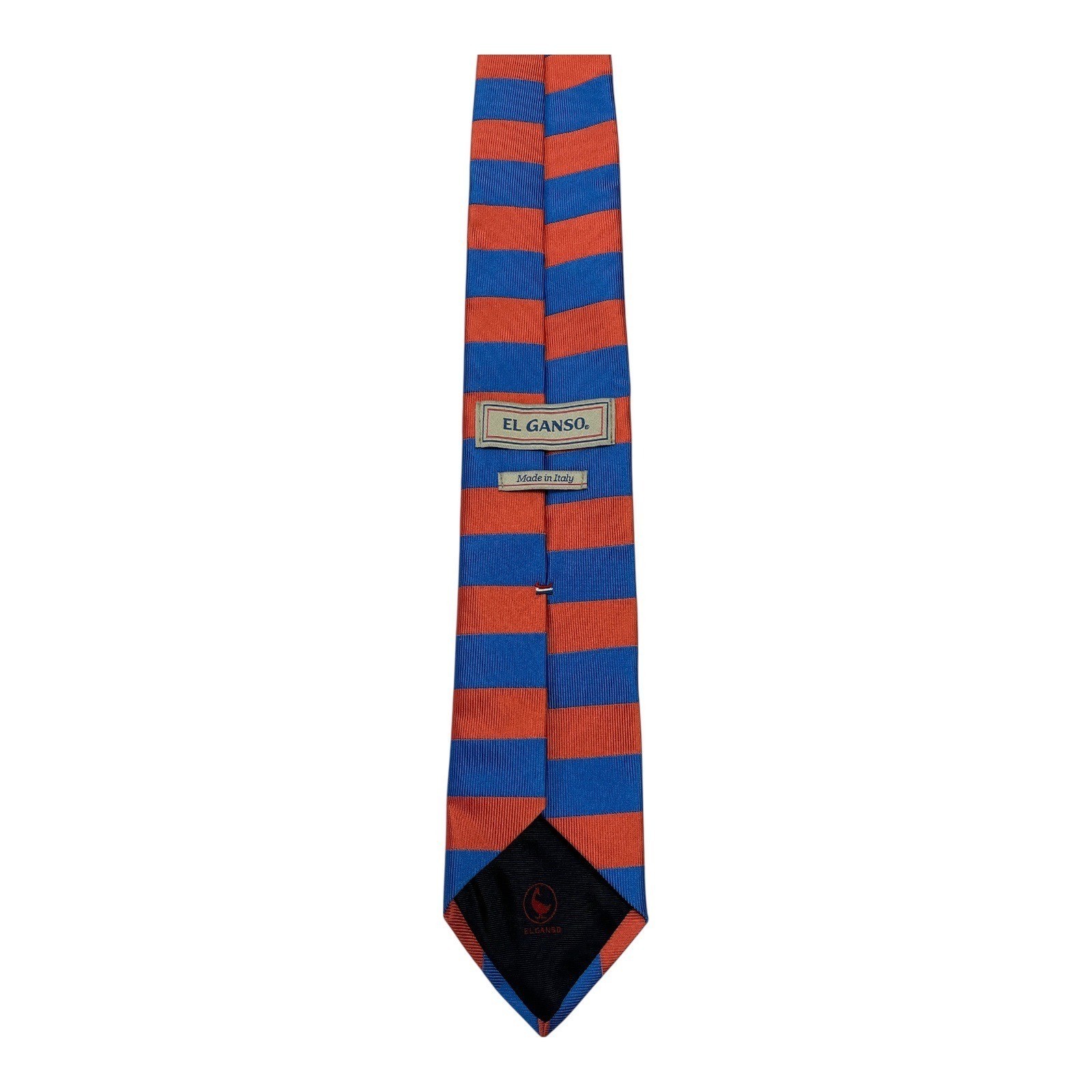 Vintage El Ganso men?s tie from the early 2000s featuring bold persimmon and blue horizontal stripes. Made in Italy, this piece offers a vibrant statement accessory perfect for business, formalwear, or modern styling.