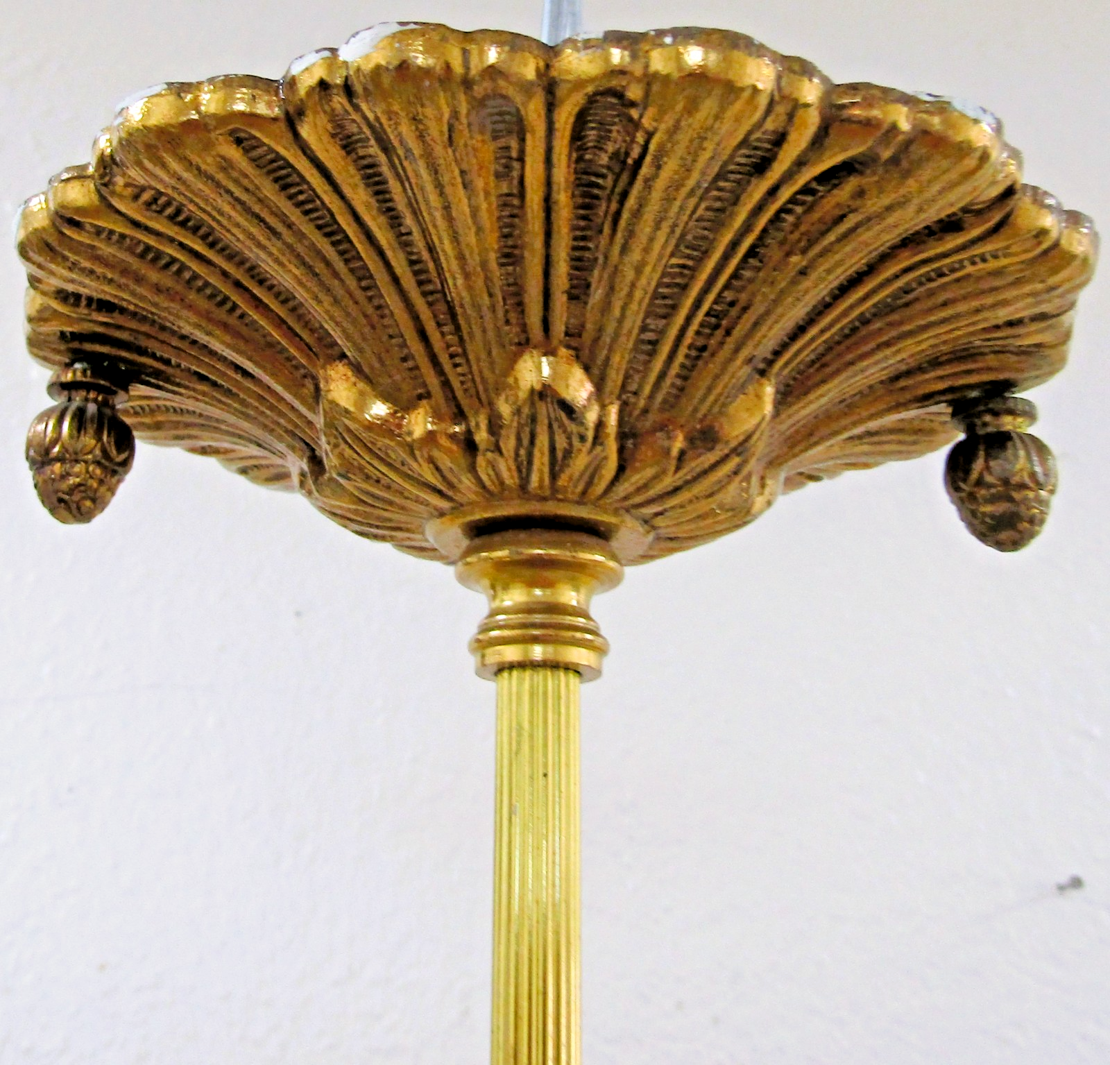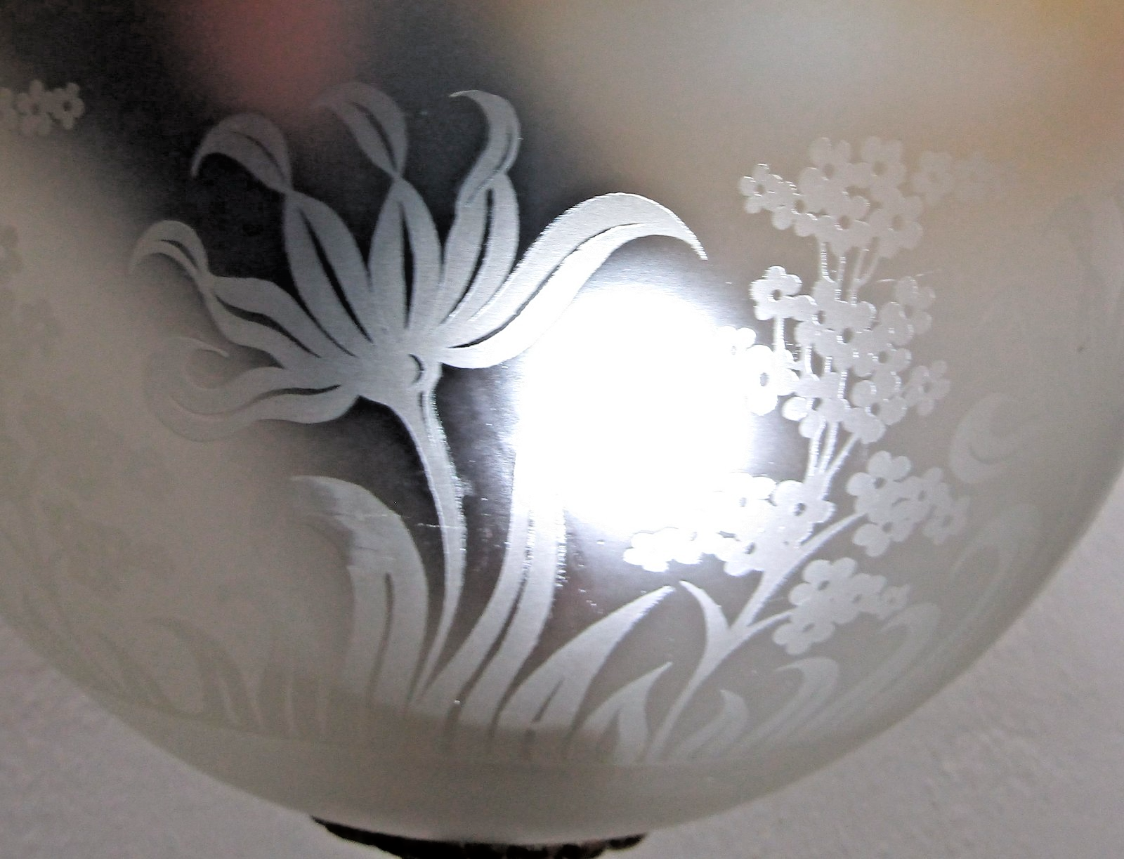 The frosted glass shade is etched with a floral design and is amber colored around the ruffled rim. The ceiling fixture has three sockets that each hold a chandelier bulb (not included). The brass down rod is grooved and the brass ceiling plate is of a botanical design with acorn nuts.