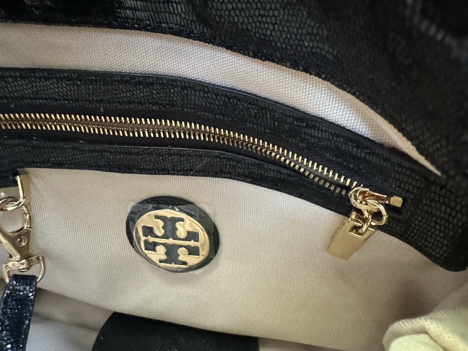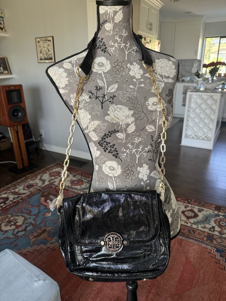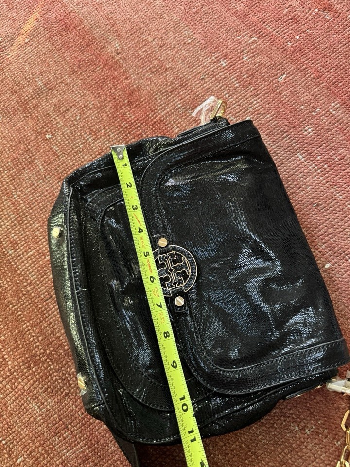 Tory Burch Glossy Flaptop Crossbody Black Leather Logo Shoulder Bag Purse NWT