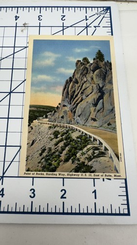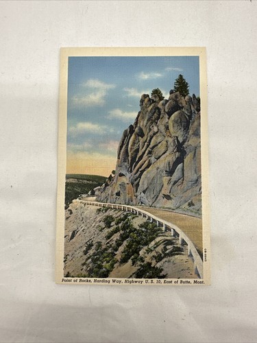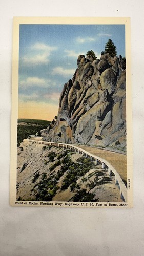 This is a linen postcard featuring a country road highway in Butte, Montana. The postcard depicts Point Rocks and Harding Way, and is part of the topographical postcards category. It is new and has not been used.