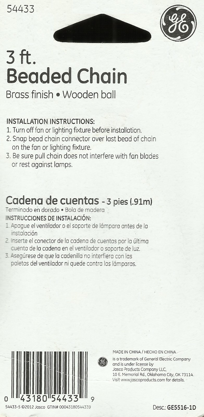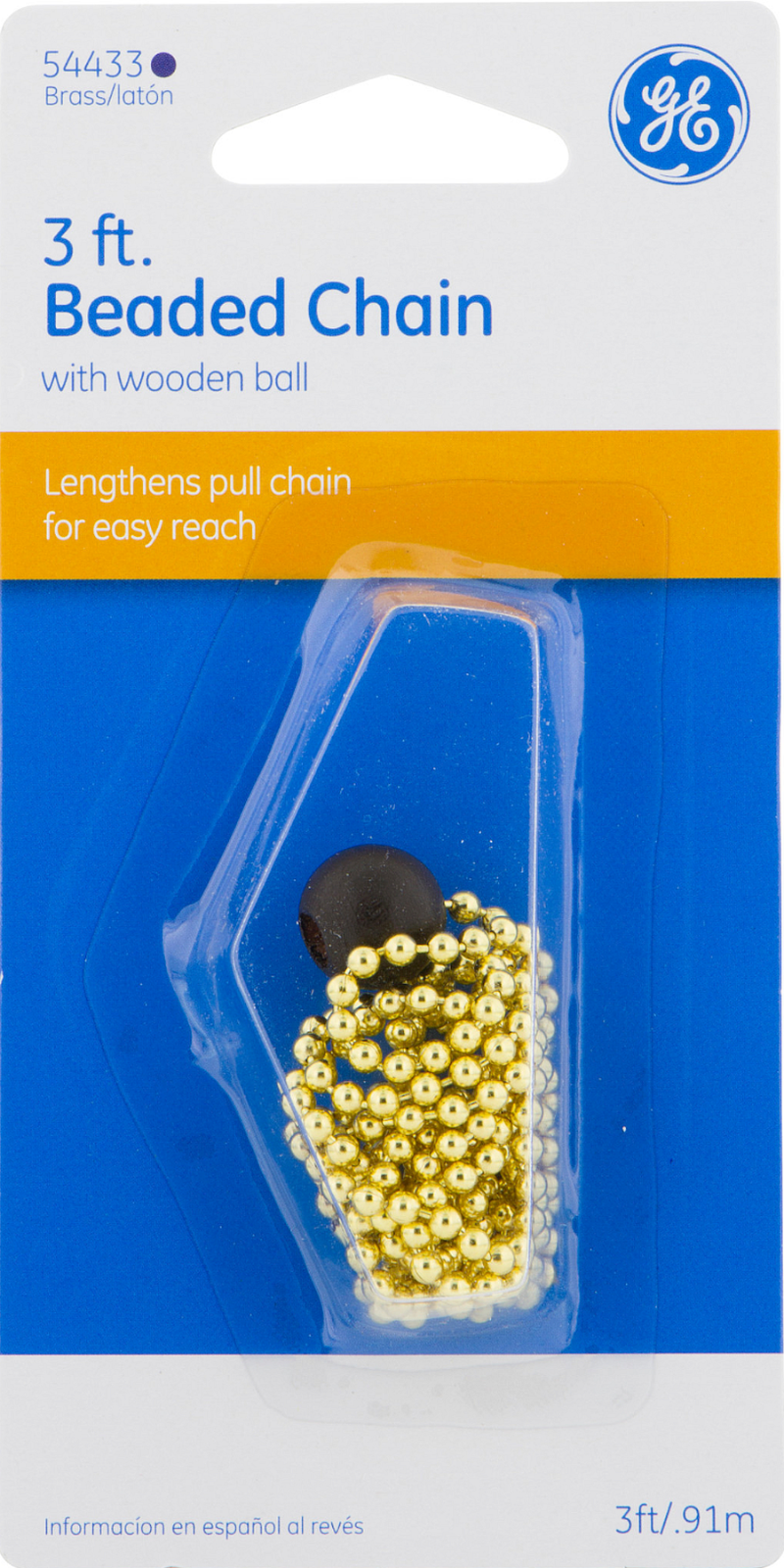 FOR SALE IS ONE (1) NEW 36" length (36 inches = 3 feet) BRASS FINISH BEADED BALL PULL CHAIN WITH BRASS CONNECTOR AND DARK BROWN WOODEN BALL BY GENERAL ELECTRIC COMPANY aka GE MPN 54433 UPC# 043180544339. REPLACE, EXTEND OR UPGRADE YOUR EXISTING CHAIN WITH THIS THREE foot (36") LONG POLISHED BRASS PULL CHAIN THAT WILL CONNECT TO YOUR EXISTING PULL CHAIN WITH THE INCLUDED BRASS CONNECTOR. FEATURES AN ATTRACTIVE AND FUNCTIONAL SMALL rOund WOOD BALL ON THE END. THREE feet (36") OF SHINY POLISHED REAL BRASS FINISH BALL CHAIN, NUMBER 6 TRADE SIZE IS 11 gauge, APPROXIMATELY 1/8" diameter BALLS (1/8" diameter = 3.2mm), APPROXIMATELY 69 to 74 BALLS PER FOOT WITH A TENSILE STRENGTH OF APPROXIMATELY 20 pounds. CREATE ANY LENGTH YOU DESIRE SINCE THIS BRASS FINISH BALL CHAIN MAY BE EASILY CUT TO FIT YOUR NEEDS WITH A PAIR OF WIRE CUTTERS (wire nippers). USE THE ENCLOSED BRASS CONNECTOR TO CONNECT TO YOUR EXISTING CHAIN. FEATURES A DARK BROWN COLOR REAL WOOD BALL AT THE END. THIS #6 size BALL CHAIN WITH BRASS FINISH IS A VERSATILE BALL CHAIN USED IN A VARIETY OF APPLICATIONS, INCLUDING PULL CHAINS FOR LIGHTS, TABLE LAMPS AND CEILING FANS LIKES ANGELUS BRAND or HARBOR BREEZE CEILING FANS. YOU WILL RECEIVE ONE (1) PACKAGE OF 36" BRASS FINISH BEADED CHAIN WITH BRASS CONNECTOR AND DARK BROWN WOODEN BALL BY GENERAL ELECTRIC COMPANY SHIPPED BY USPS FIRST CLASS MAIL.....