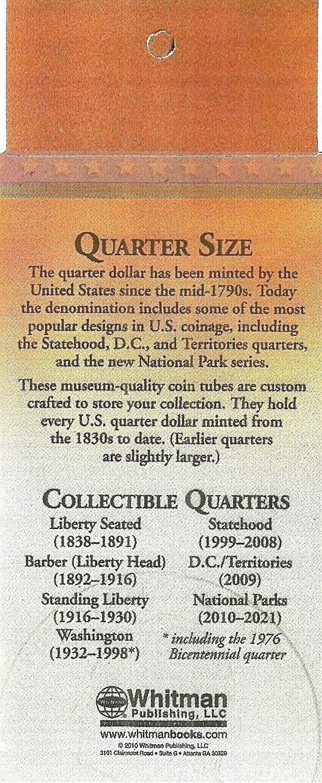 FOR SALE IS ONE (1) NEW PACK OF FIVE (5) QUARTER SIZE CLEAR PLASTIC COIN TUBES WITH TWIST OFF CAPS MANUFACTURED BY H.E. HARRIS MARKETED BY WHITMAN PUBLISHING MPN 0794828930 UPC# 9780794828936 ISBN 978-079482893-6. BUILT TO LAST, THESE MUSEUM QUALITY, HIGH IMPACT CLEAR PLASTIC QUARTER TUBES ARE BUILT WITH EXCELLENT QUALITY AND DURABILITY. NO COINS ARE INCLUDED IN THIS SALE, JUST FIVE (5) CLEAR TUBES MADE OF ACID FREE STAY CLEAR PLASTIC (inert polystyrene), EACH CLEAR COIN TUBE WITH TWIST OFF CAP HOLDS 40 QUARTERS, EASY TO OPEN AND CLOSE. THESE QUARTER STORAGE TUBES HOLD EVERY QUARTER DOLLAR MINTED FROM THE 1830s TO DATE (earlier pre 1830 quarters are slightly larger). FIVE (5) CLEAR COIN TUBES TOTAL PER SALE. EACH TUBE BEARS THE H.E. HARRIS IMPRINT ON THE BOTTOM AND IS MARKETED BY WHITMAN PUBLISHING. YOU WILL RECEIVE A PACKAGE OF FIVE (5) CLEAR QUARTER COIN TUBES WITH SCREW ON CAP, SHIPPED BY USPS FIRST CLASS MAIL.....