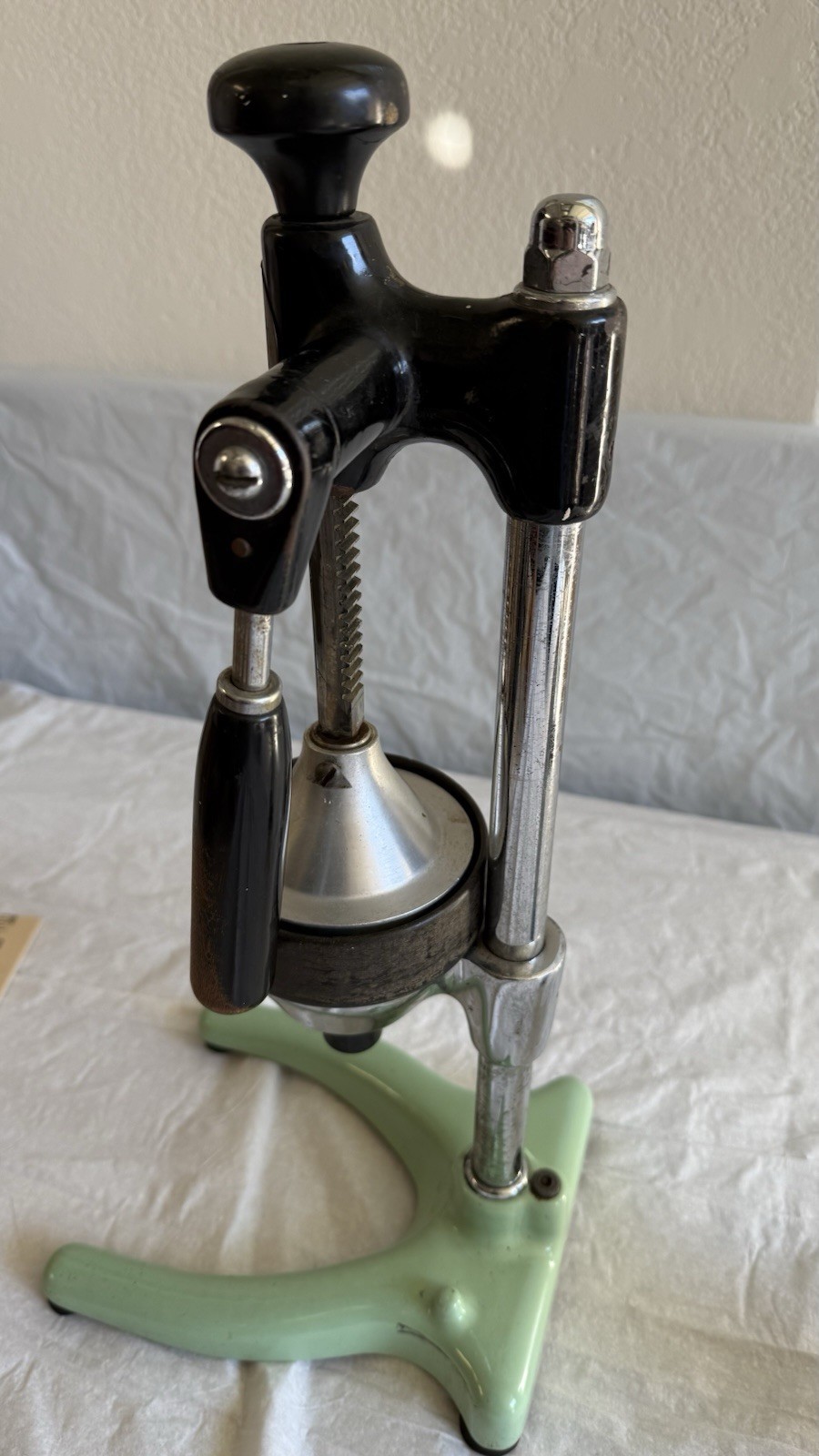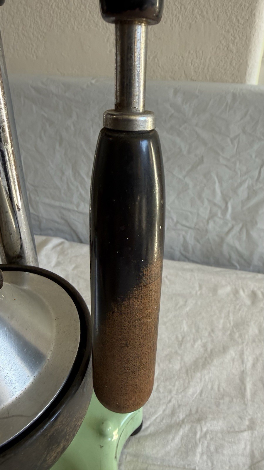 The VTG Hamilton Beach Extractor "Arnold No 31" is a commercial-grade citrus press/juicer made in the USA. This manual juicer, with a green color and missing bottom piece, is designed for heavy-duty use in a kitchen setting. The Hamilton Beach brand ensures quality and durability, making it an ideal choice for those looking to extract juice efficiently and effectively.