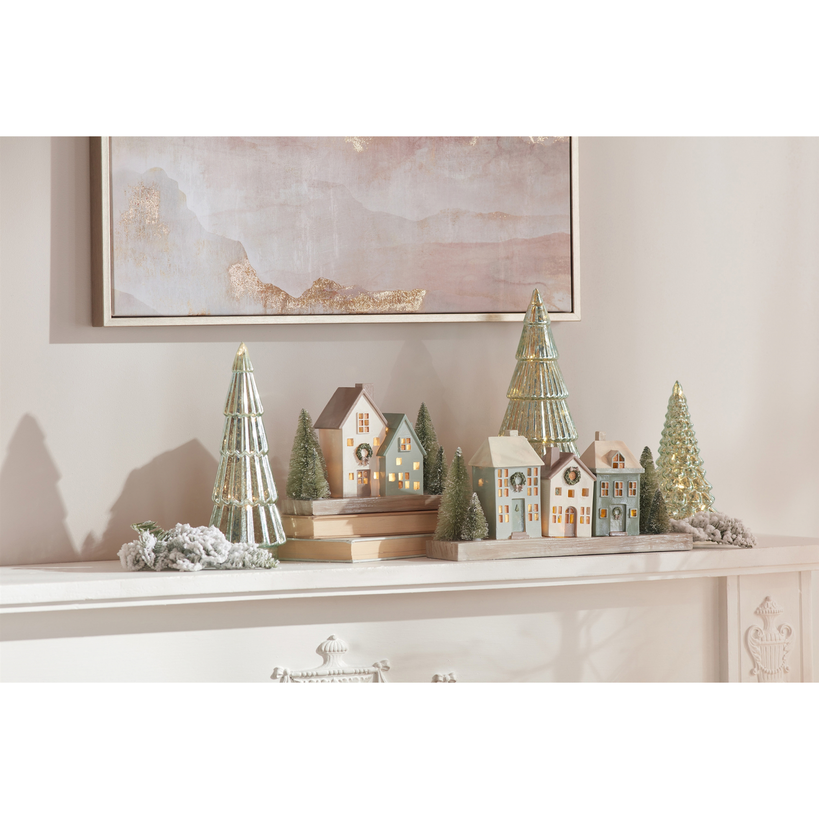 Create a charming winter scene with the LED Winter Village! Featuring traditional house shapes in wintry sage green, gray, and white tones, these beautifully crafted resin houses bring a warm and cozy glow to your seasonal decor. Delicate frosted bottle brush pine trees add a festive touch, making this set perfect for a tabletop, shelf, or mantel display. The built-in LED lights provide a soft illumination, creating a magical holiday ambiance when paired with floral arrangements or holiday figurines. Powered by batteries, this village scene offers effortless elegance and versatility.