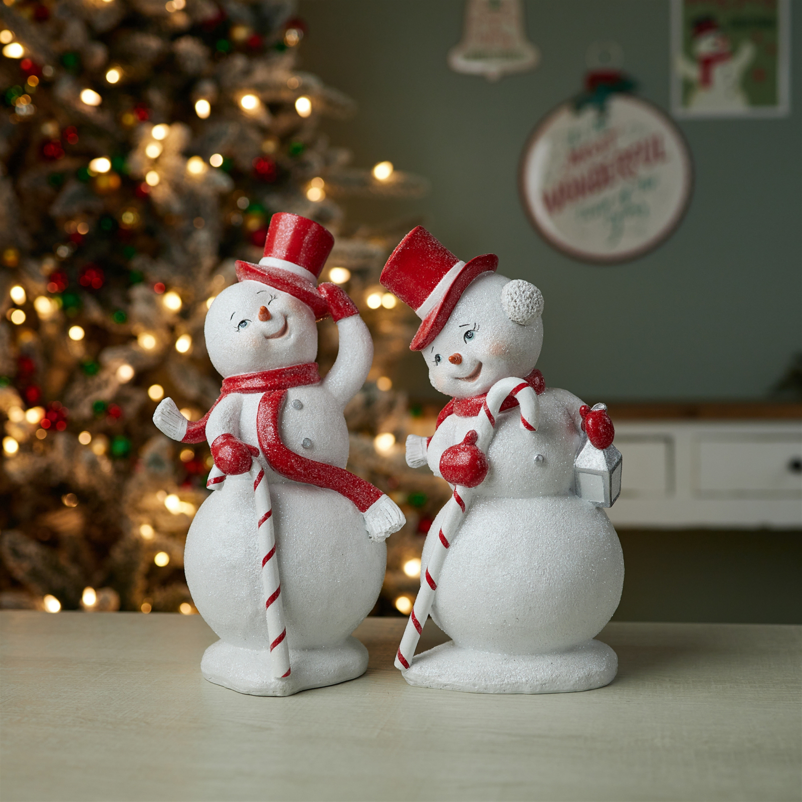 Festive Pair Includes two coordinating snowmen for a balanced display. Charming Details Red top hats, scarves, and striped candy canes add holiday flair. Playful Accents One snowman tips his hat while the other carries a lantern for added character. Suitable for indoor use only