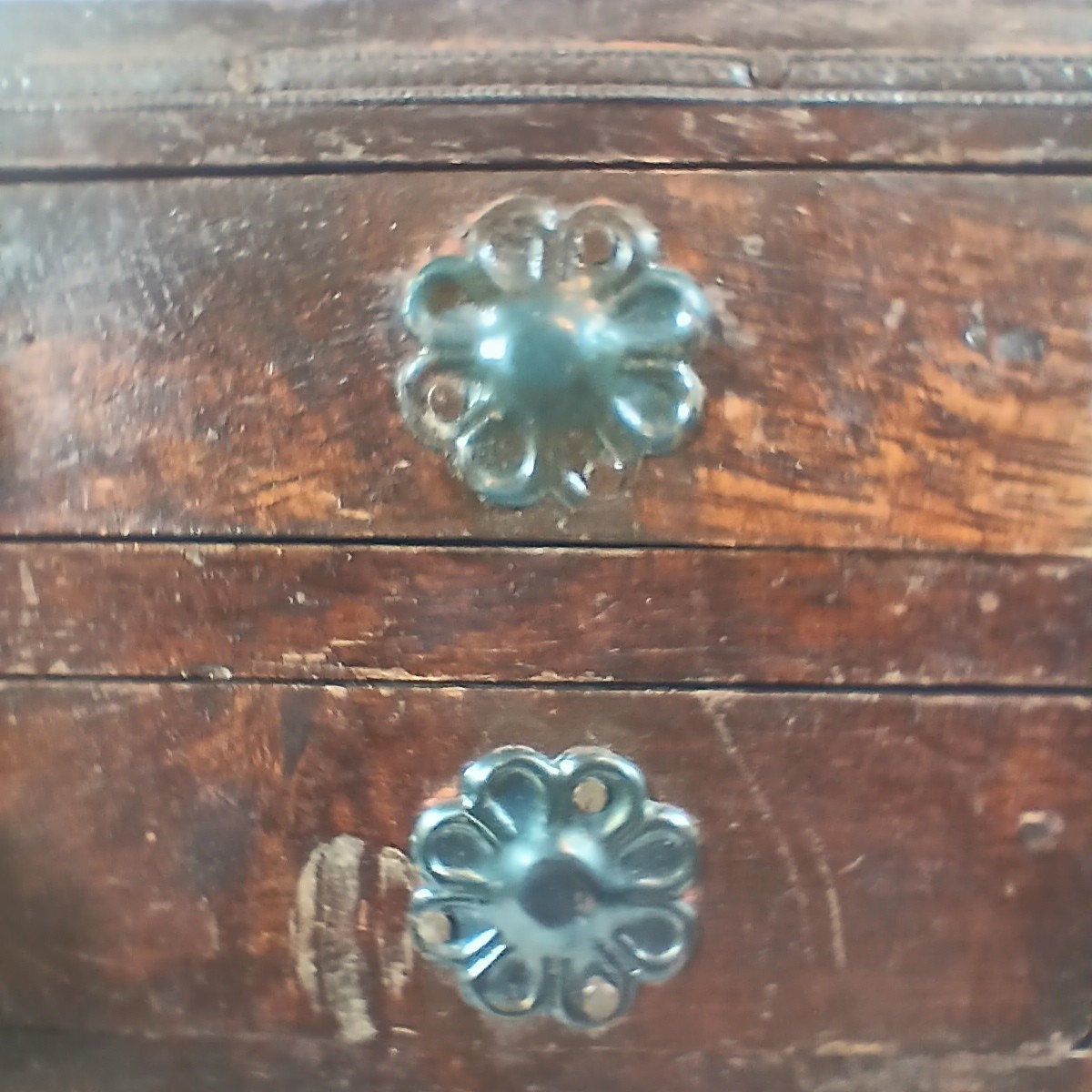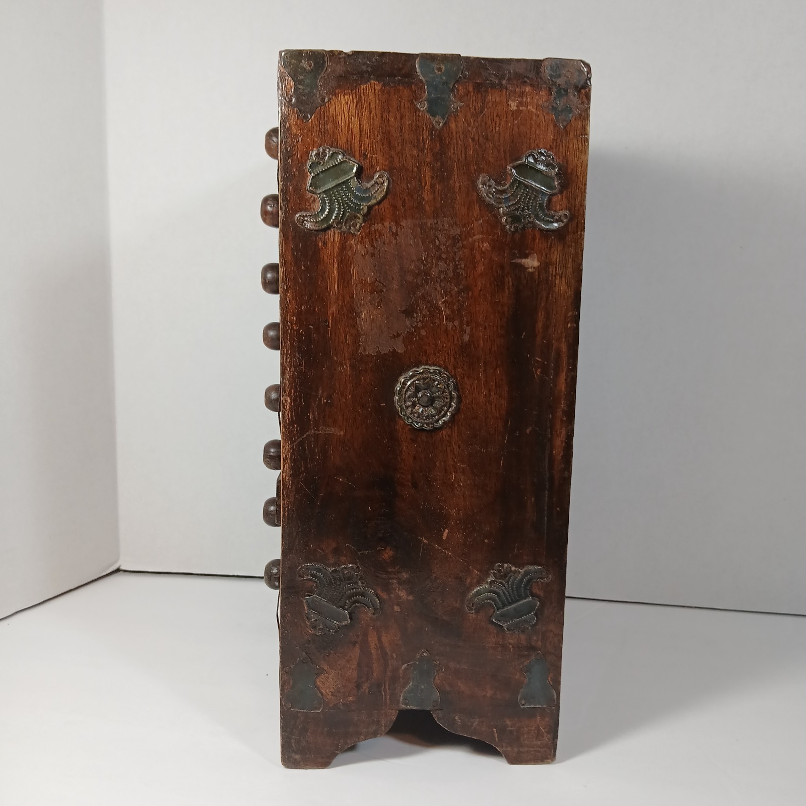 Often described as a miniature cabinet or apprentice chest, this piece likely dates from the mid-20th century (1950s?1970s). The metal appliques and construction style point to a handcrafted or artisan-made origin, possibly imported from Europe or Asia.
