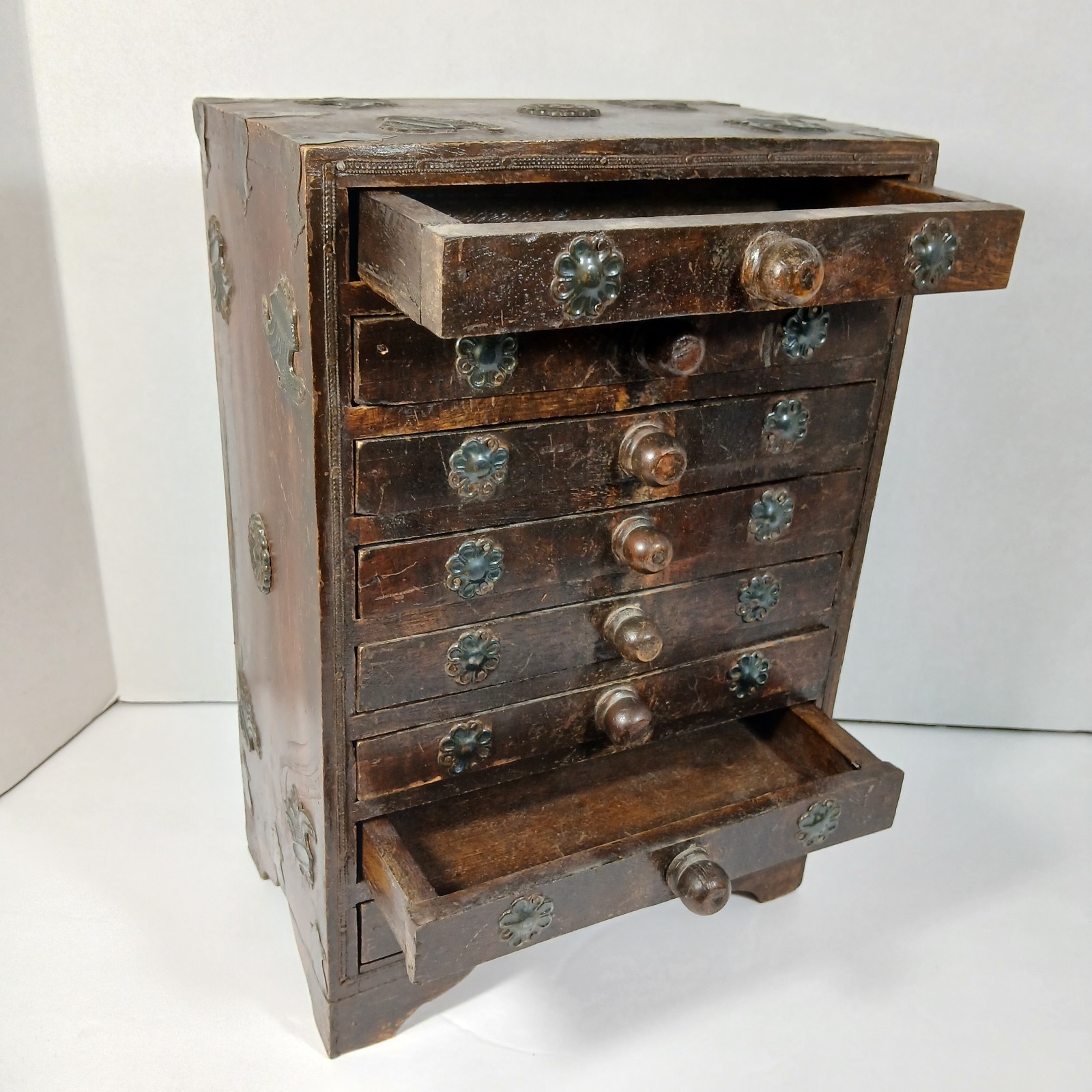 Great way to organize any tiny collection. Charming vintage miniature chest of drawers, beautifully hand-crafted from wood and decorated with pressed metal accents in floral and fan motifs. This six-drawer cabinet has turned wooden knobs, graceful bracket feet, and a warm, aged patina that shows decades of gentle use.