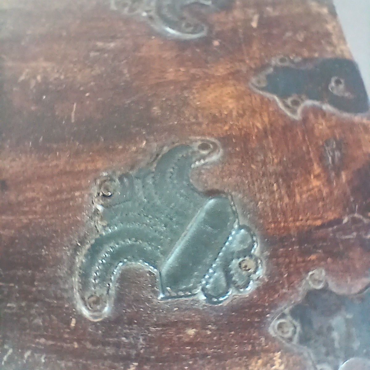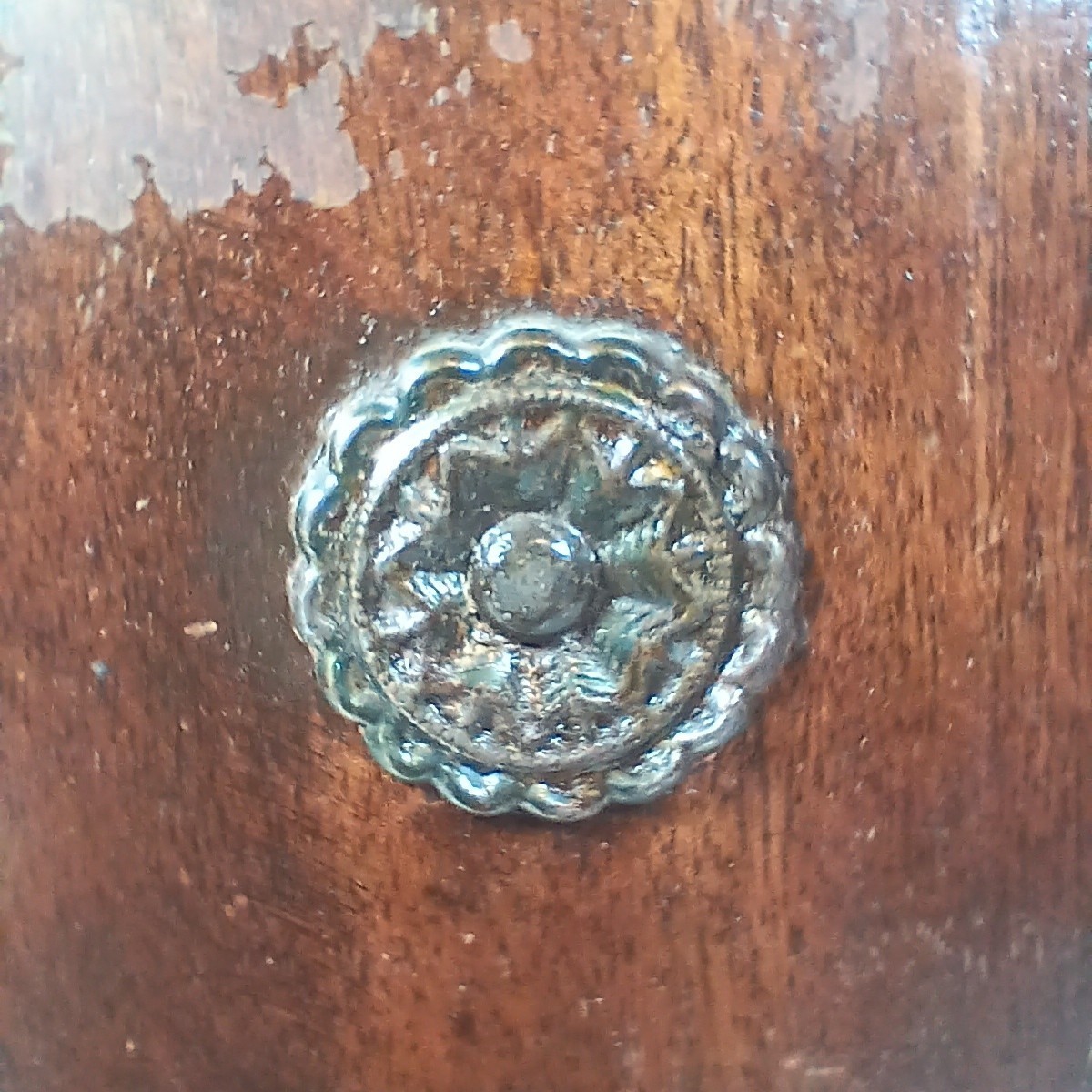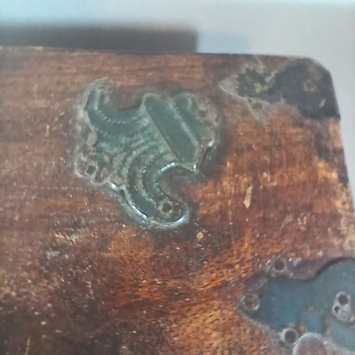 Material: Solid wood with decorative metal accents. May be rosewood. Its a hardwood and very heavy.
