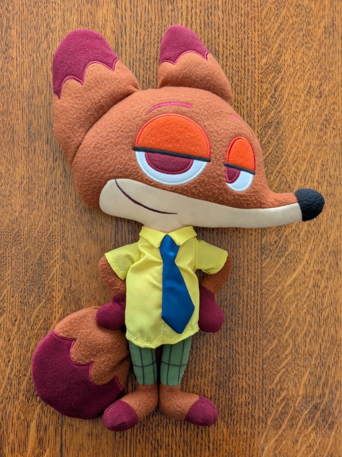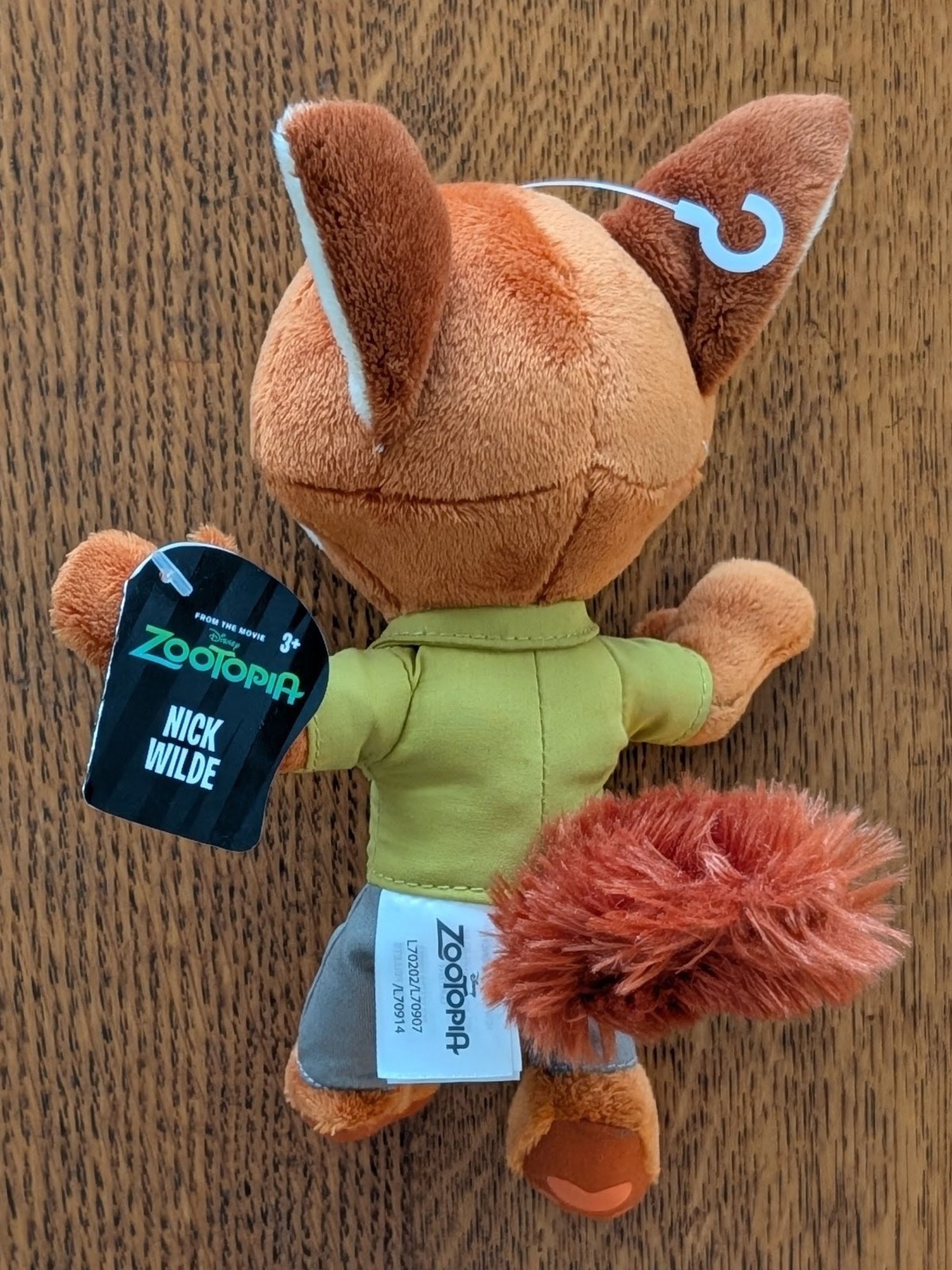 Nick Wilde is a Stuffed Toy Collectible and is the deuteragonist of the 2016 animated feature film Zootopia. He is a con-artist fox in the city of Zootopia who finds himself compelled to aid Officer Judy Hopps, a rabbit in her investigation. There are 2 of him listed. A 14" size and an 8" size.