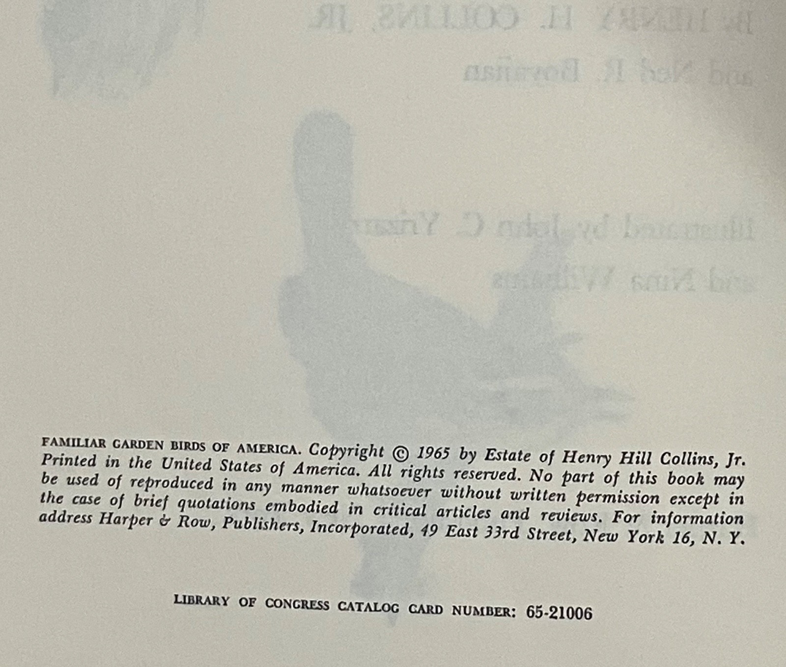 New York, NY: Harper Row, 1965. 1st Ed. Illustrated by John C Yrizarry and Nina Williams. Birds common to American gardens and feeding stations throughout the continental US are the subject of this book which identifies 75 familiar species. Drawing on expert field research from each region, the book supplies concise life histories of the birds that have delighted American since the days of Audubon and Wilson.
