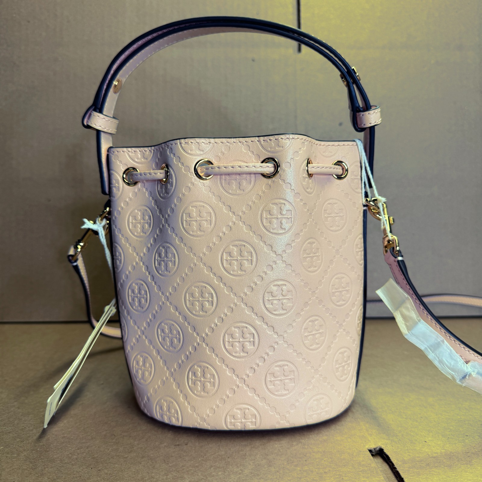 Mini Bucket Bag closes with drawstrings, secured by our gold Double T cord