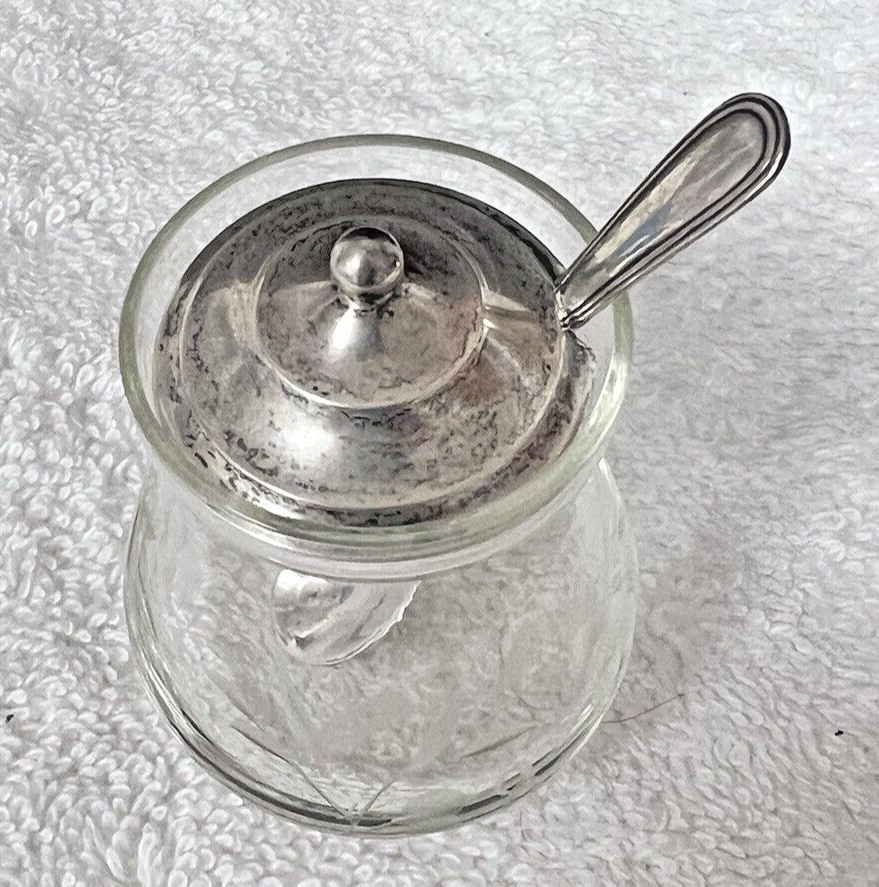 Antique Webster Sterling & Crystal Mustard Jar w Lid & Spoon Etched Floral Jar