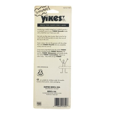One new-old-stock and sealed package of four classic 90s YIKES! Screwballs pencils in bold color-clashing orange / lime green, purple / turquoise, orange / purple and yellow / teal. Pencils are HB #2 Black Lead. Made in USA. Copyright on back is 1993. There is some moderate wear on the package exterior, please see pictures for exact condition details. Tag lines include Screaming Erasers Screw Up Screw-ups, Royally Screwed Up for Comfort Grip, Colors Clash to the Nub, Pencils Your Parents Won?t Swipe! Item No. 91320. From a smoke-free home. Ships next day!