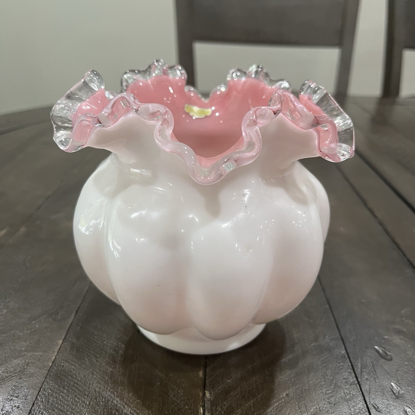 Fenton Peach Pink Crest Mellon Vase Silver Crest White Milk Glass Sticker 1940s
