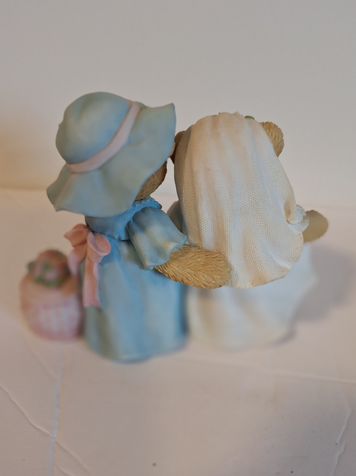 The Cherished Teddies "Destiny and Kay" Bridal Bear Figurine from Priscilla Hillman is a ceramic figurine depicting a bear couple named Destiny and Kay. Created in 2000, this original piece from the Cherished Teddies brand showcases a wedding theme, making it a sentimental and charming addition to any collection. Perfect for bear enthusiasts and collectors alike, this figurine captures the innocence and joy of a special day in the lives of these beloved characters.